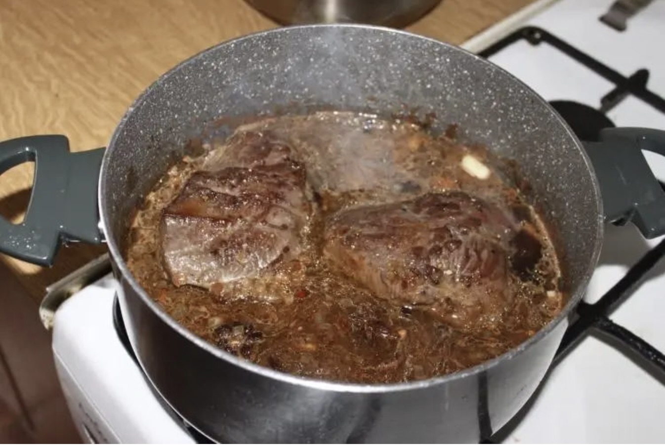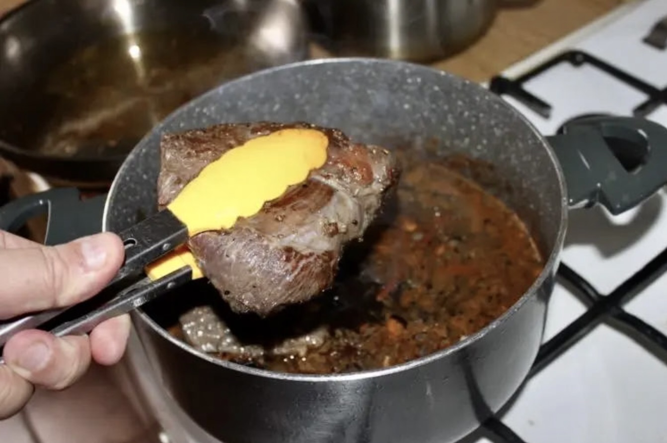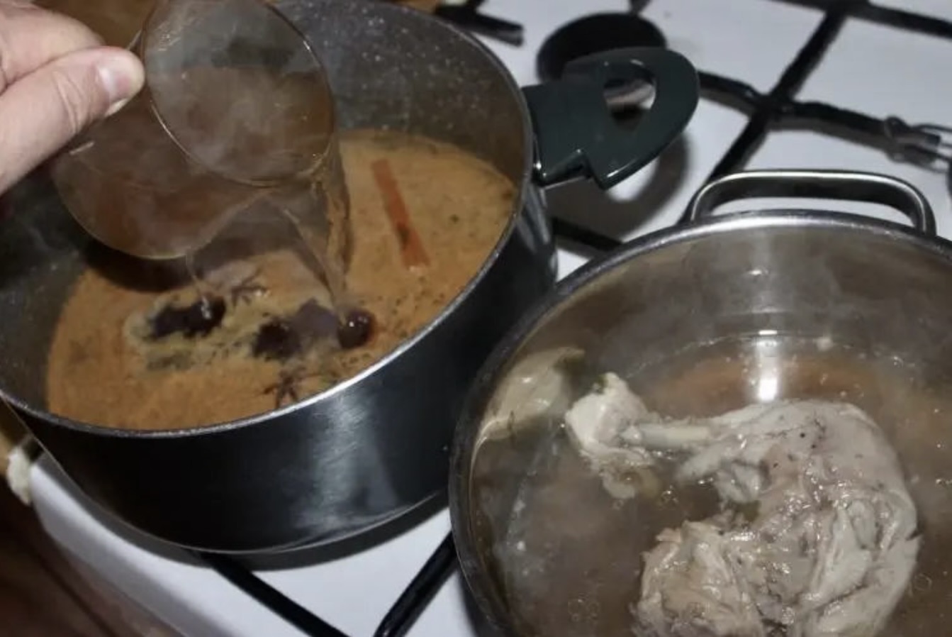 Na patelnię po smażeniu wlej chochlę wywaru, zeskrob pozostałości, a następnie przelej płyn do garnka (deglasowanie).