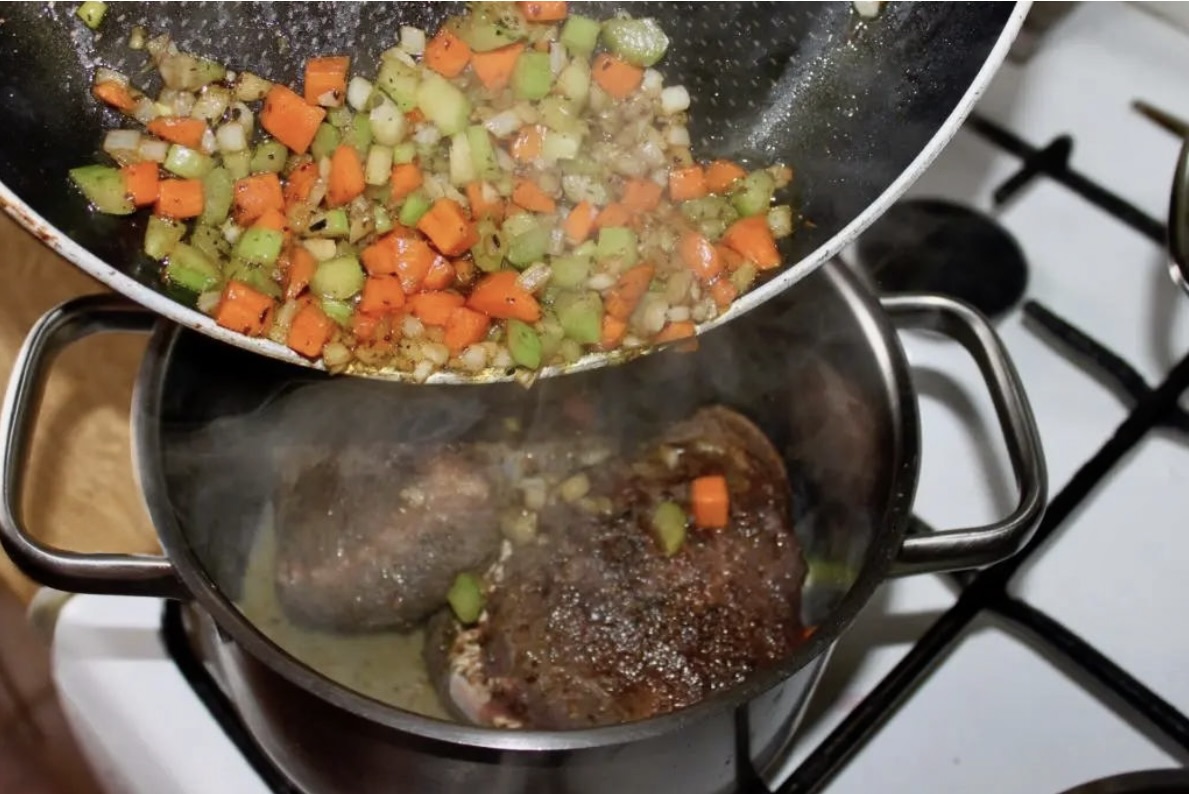 Przełóż warzywa do garnka z mięsem.