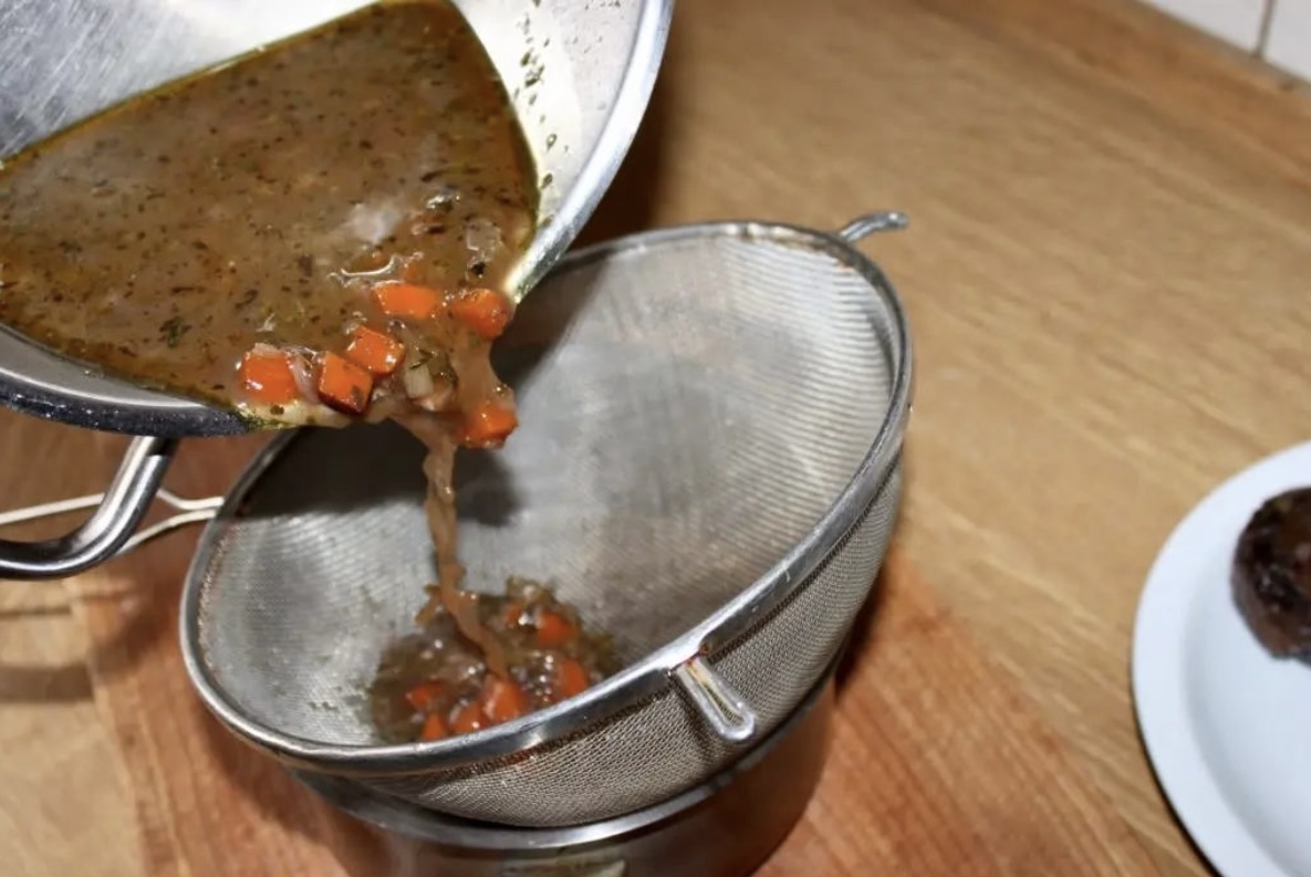 Przecedzony sos pozostaw na około 5 minut, aż na wierzchu zbierze się tłuszcz. Zdejmij jego nadmiar łyżką.