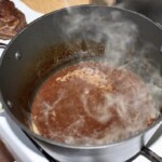 Kończenie sosu: Mięso wyjmij z garnka i odłóż. Sos przecedź przez sitko, usuń tłuszcz z powierzchni i odparuj na dużym ogniu do pożądanej gęstości.