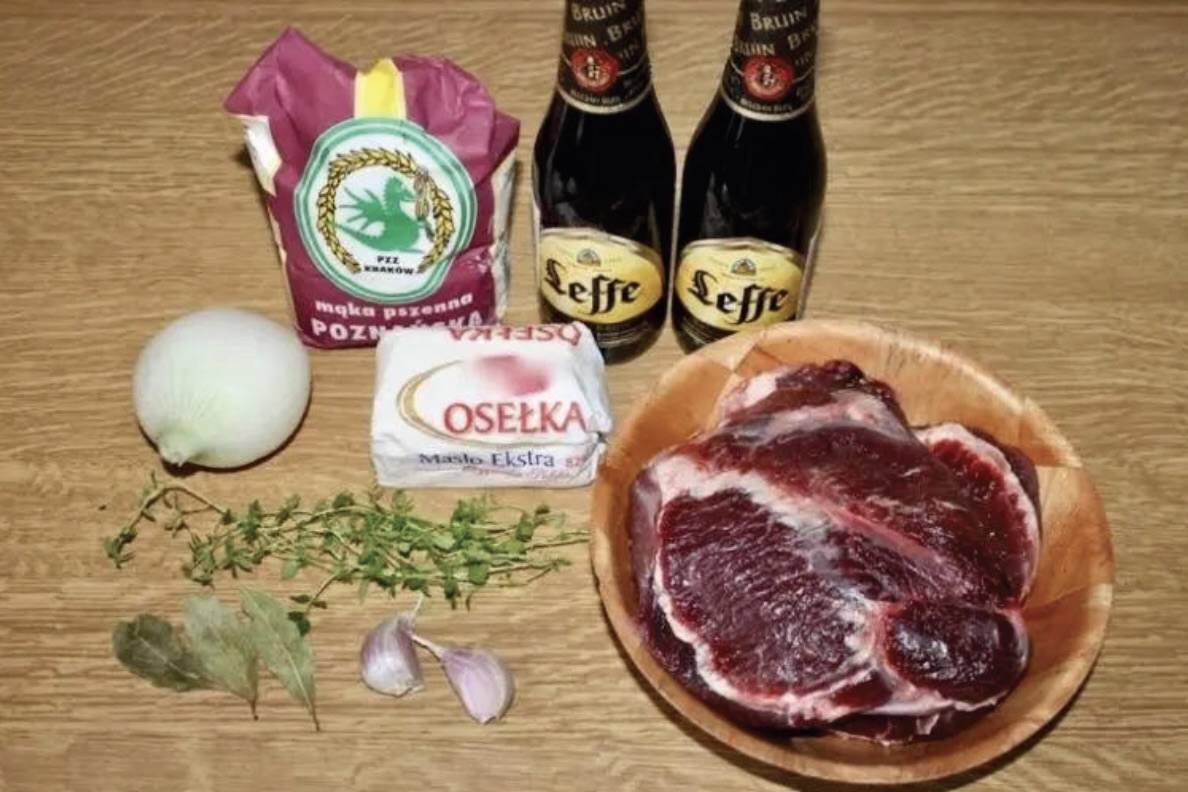 Duszenie: Do garnka wlej ciemne piwo oraz bulion wołowy (lub wodę). Dodaj przesmażone mięso, wyciśnięty czosnek, szczyptę cukru, sól i świeżo zmielony pieprz.