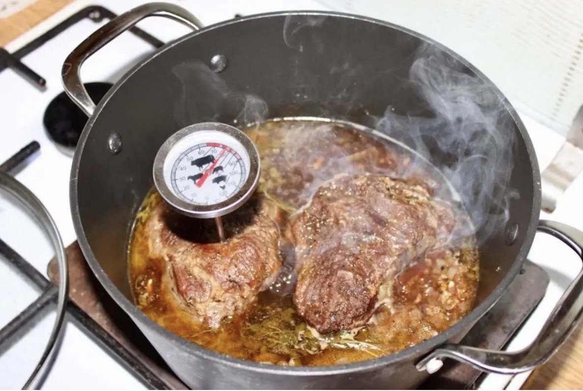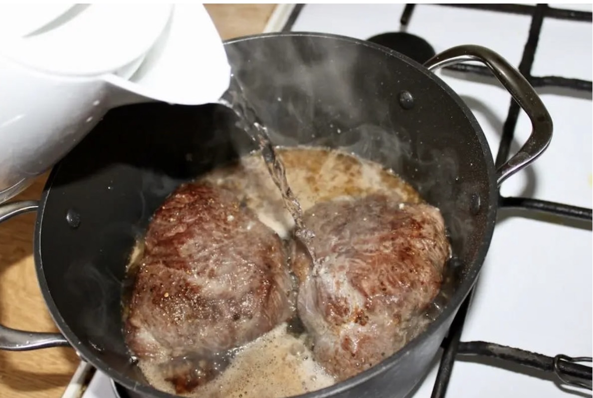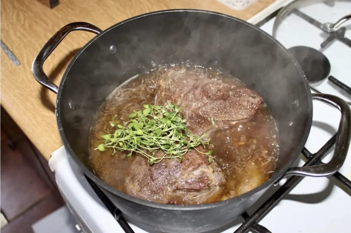Gotowanie: Zmniejsz gaz pod garnkiem do minimum, przykryj pokrywką, a następnie duś mięso na wolnym ogniu przez 2,5 do 3 godzin. Co pół godziny odwracaj mięso na drugą stronę.