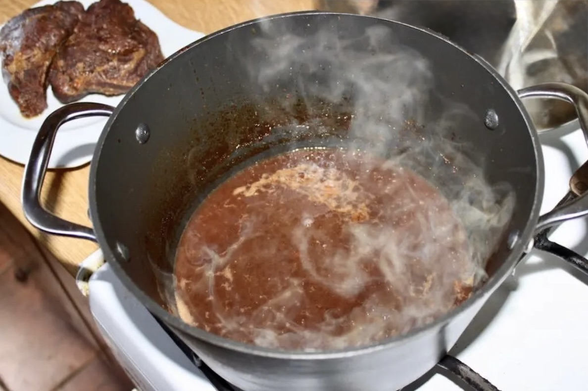 Kończenie sosu: Mięso wyjmij z garnka i odłóż. Sos przecedź przez sitko, usuń tłuszcz z powierzchni i odparuj na dużym ogniu do pożądanej gęstości.