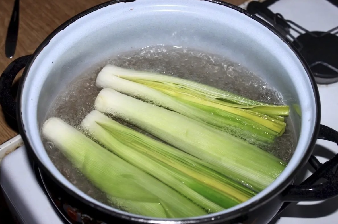 Wrzuć pory do gotującej się wody z dodatkiem cukru.
