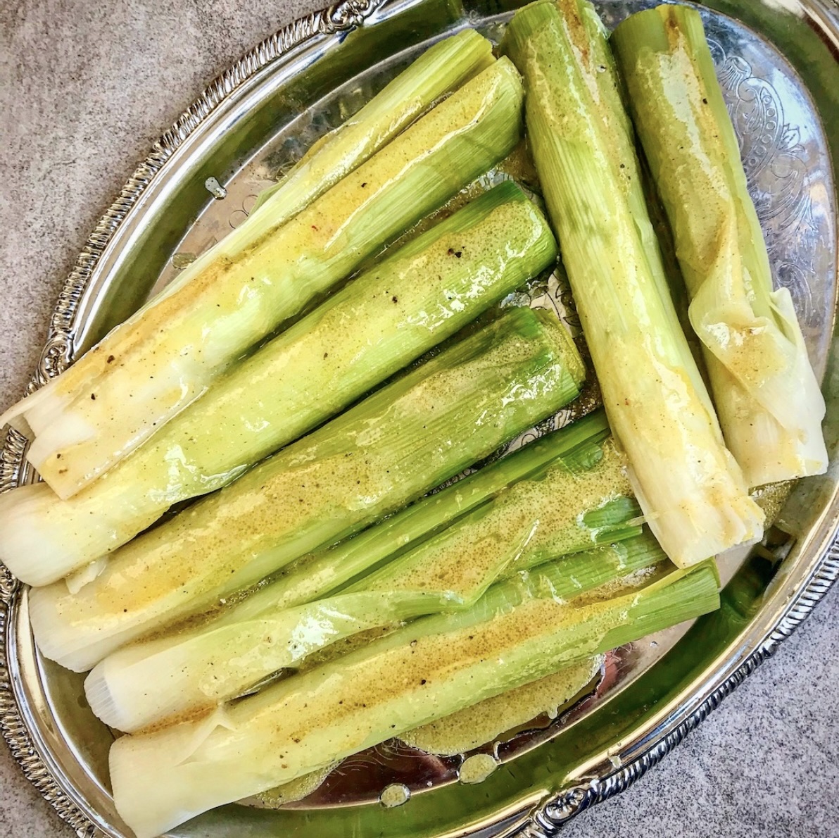Pory gotowane, a następnie polane kwaskowym sosem winegret z dodatkiem musztardy Dijon.