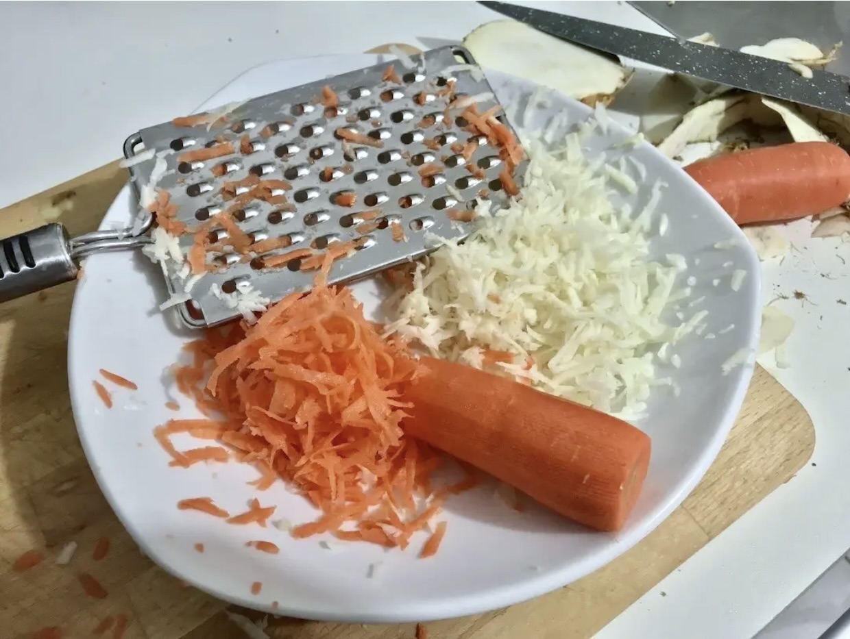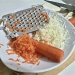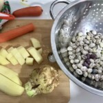 Podczas gdy żeberko się gotuje, przygotuj fasolkę, ziemniaka pokrój w drobną kostkę, oczyść korzeń selera. Marchewkę oraz selera zetrzyj na dużych oczkach tarki.