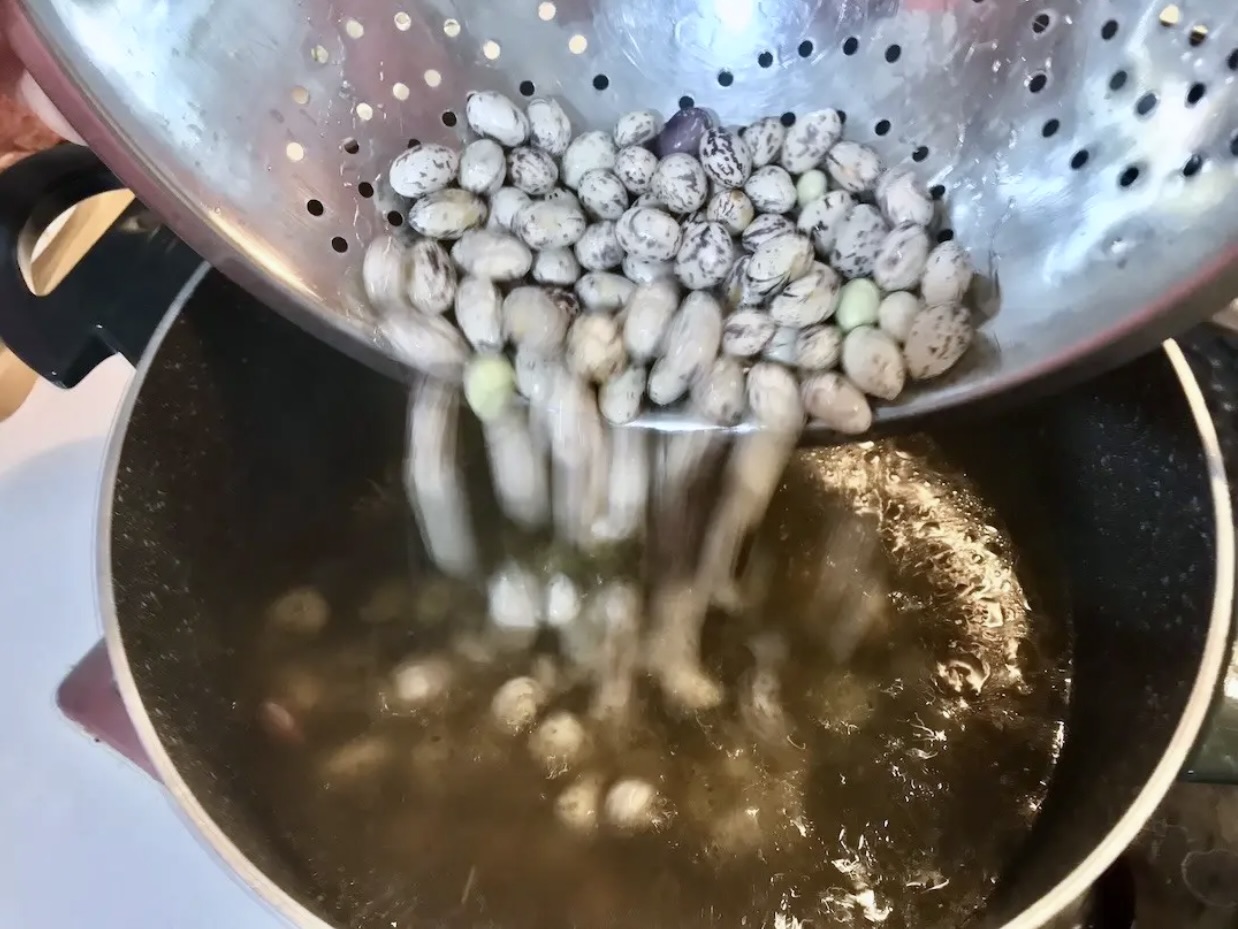 Pozostały wywar przecedź przez sito. Do wywaru wrzuć fasolkę, a następnie gotuj zupę około 10 minut na średnim ogniu.