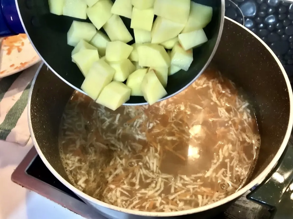 Teraz wrzuć do zupy starte warzywa oraz ziemniaki.