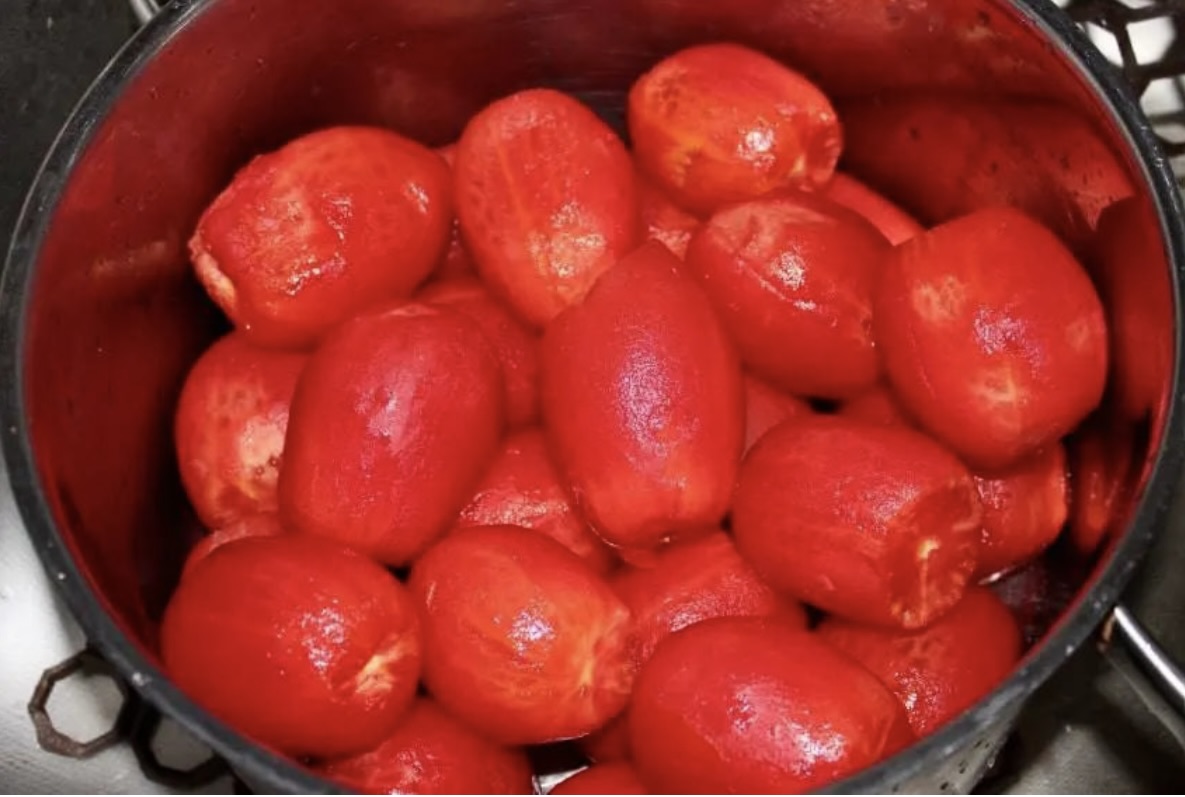 Blanszowanie: Pomidory ponacinaj lekko na obu końcach. Włóż je do garnka, zalej wrzątkiem, a po minucie przełóż zimną wodą.