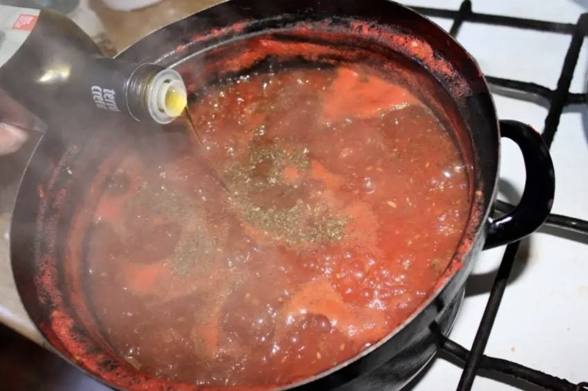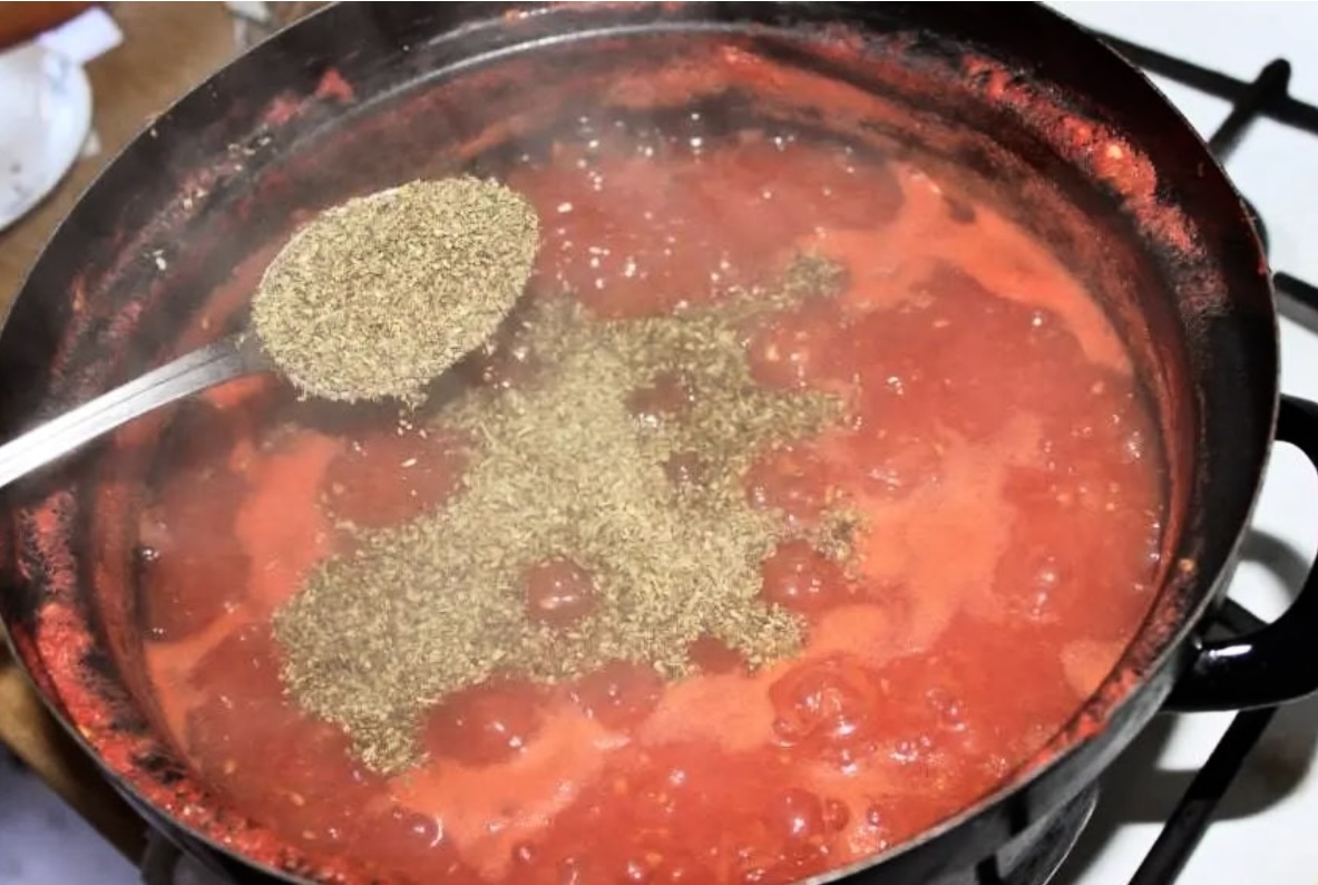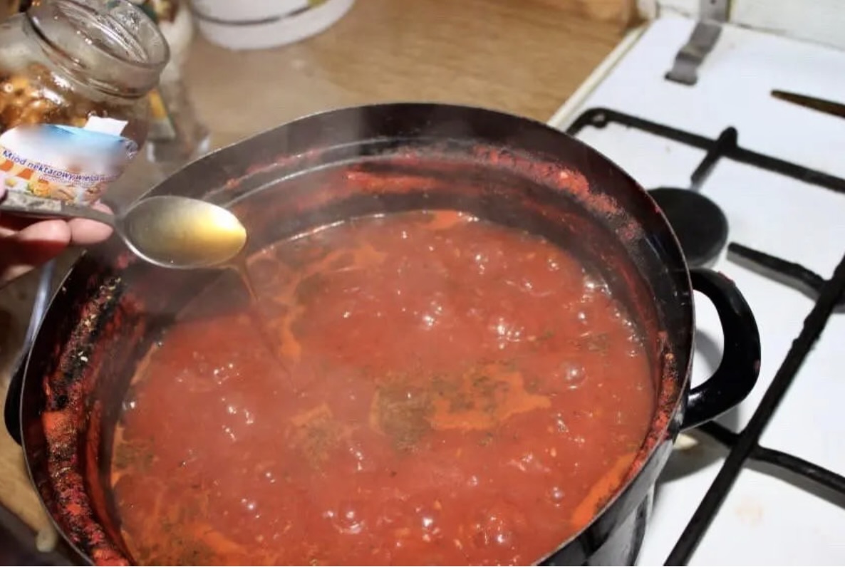 Doprawianie: Po tym czasie dodaj 1 łyżkę suszonego oregano, 1 łyżeczkę mielonego pieprzu i 1 łyżeczkę soli. Wlej również 2 łyżki oliwy extra vergine. Jeśli uznasz, że sos jest zbyt kwaśny, dodaj 2 łyżeczki miodu.