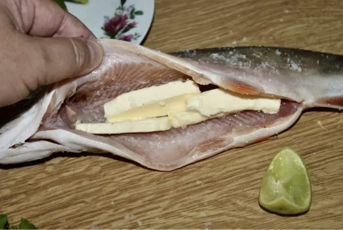 Wypełnij wnętrze pstrąga masłem i sporą ilością natki pietruszki.