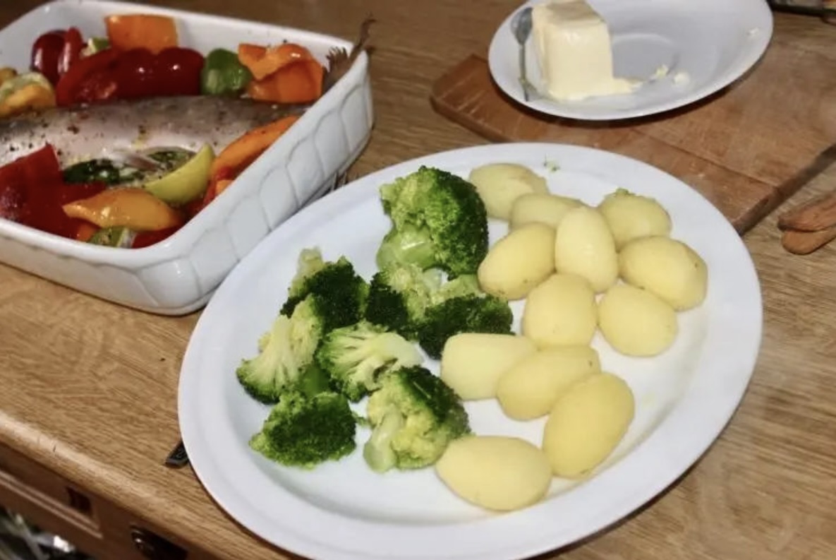 Do naczynia z pieczoną papryką wrzuć podgotowane ziemniaki i brokuły.