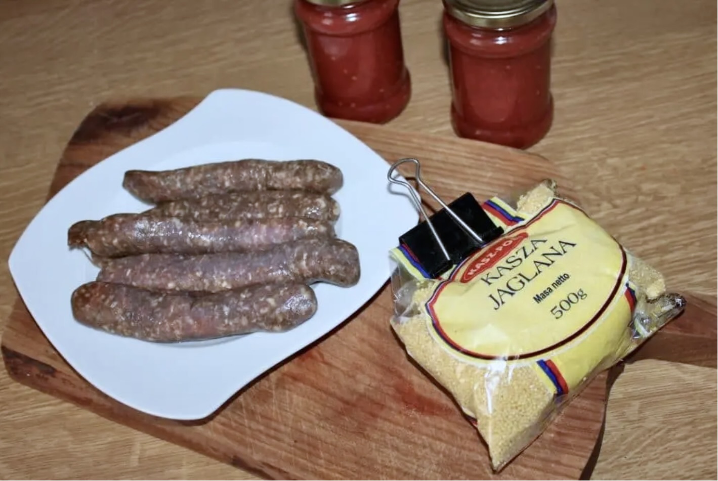 Przygotowanie masy na pulpety: Wyjmij mięso z osłonek kiełbasek merguez i rozdrobnij. Włóż mięso do miski i wsyp do niego kaszę jaglaną (zacznij od nieco więcej niż połowy, a resztę dodaj w razie potrzeby).