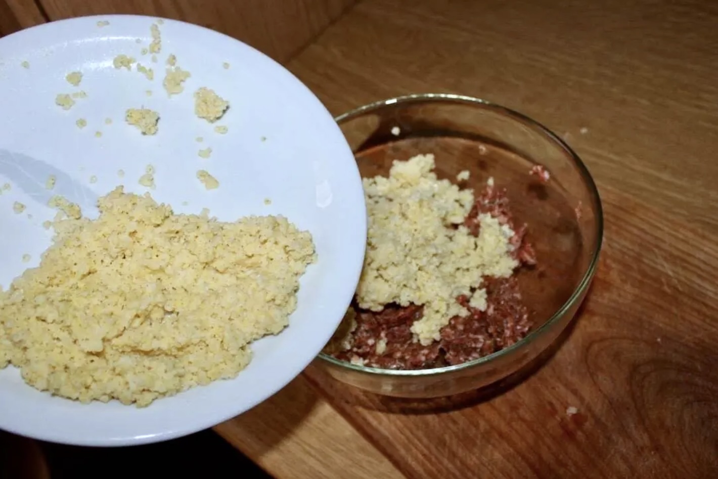 Wyrabianie: Bardzo dokładnie wymieszaj kaszę jaglaną z mięsem, aby powstała klejąca się masa. Dodaj posiekany szczypiorek i jeszcze raz wyrób masę. Kasza jaglana ma za zadanie „związać” pulpety.