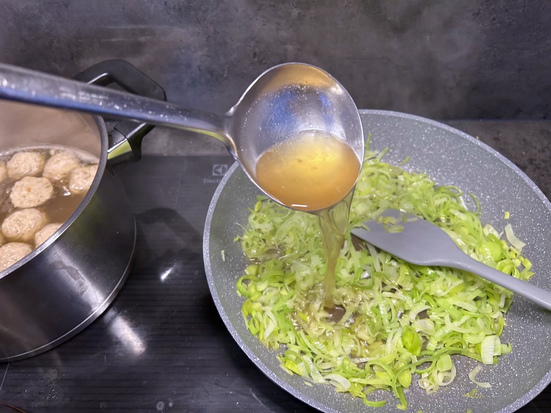 Wlej na patelnię chochelkę gorącego bulionu z garnka z pulpetami.