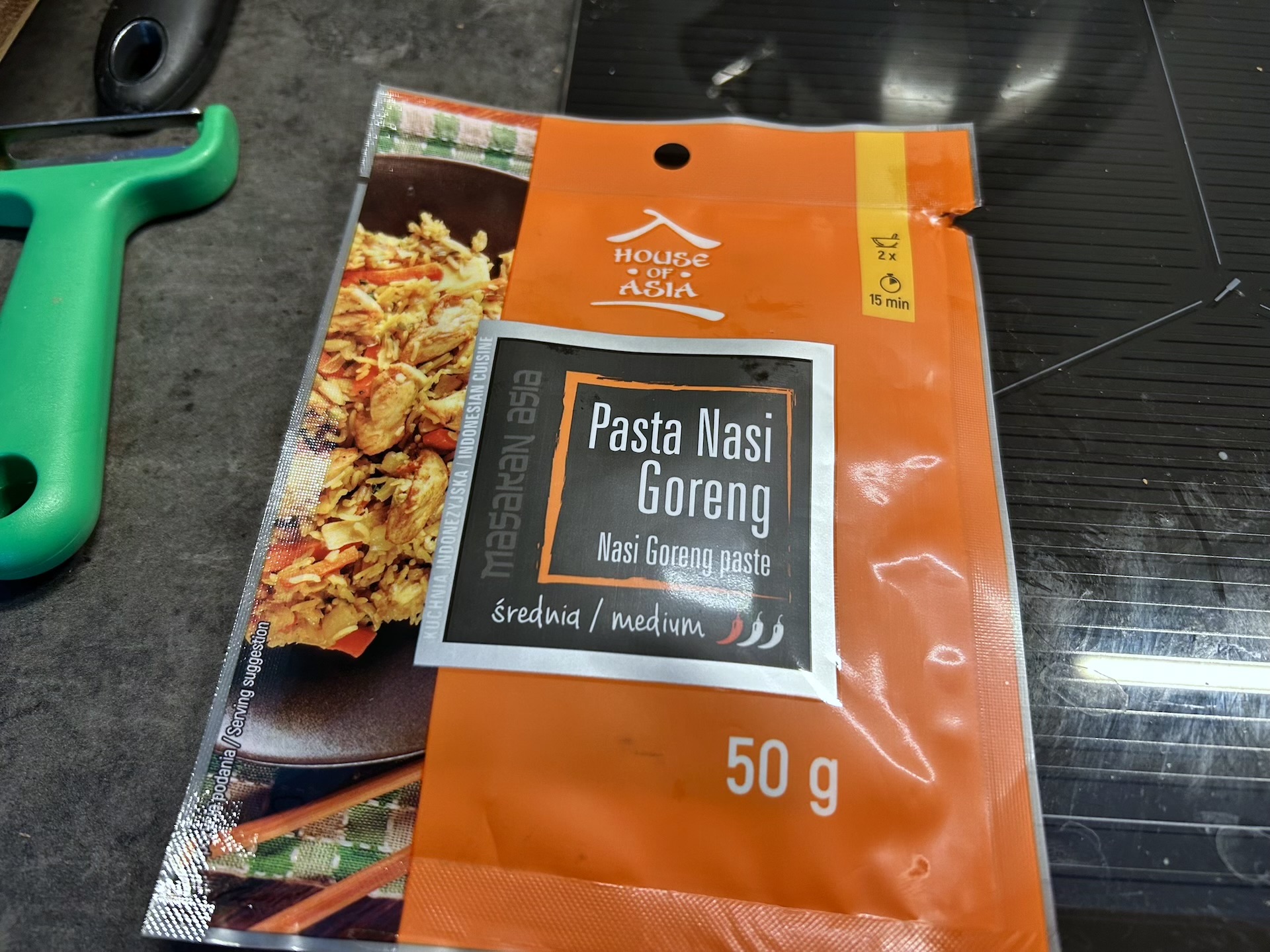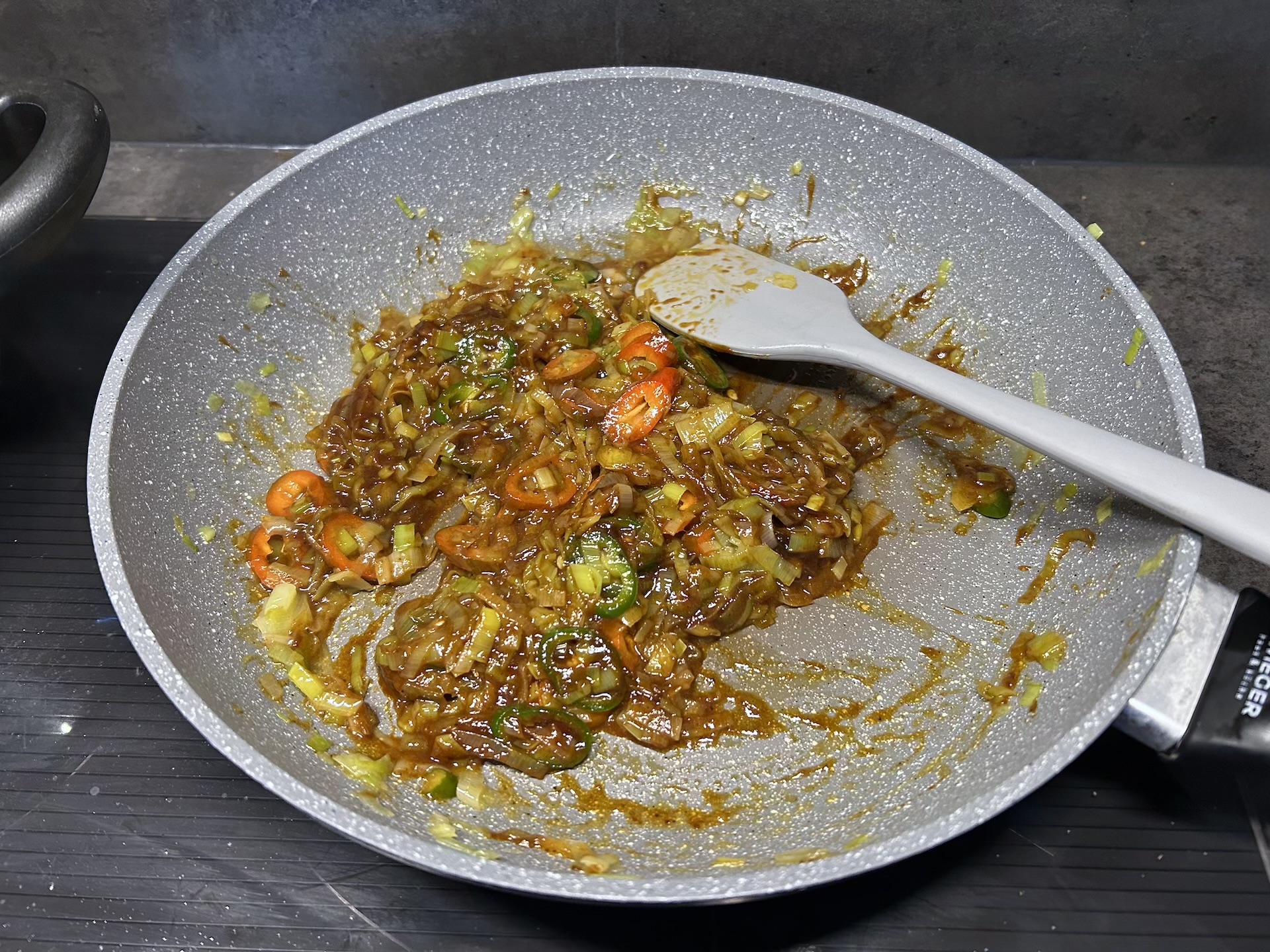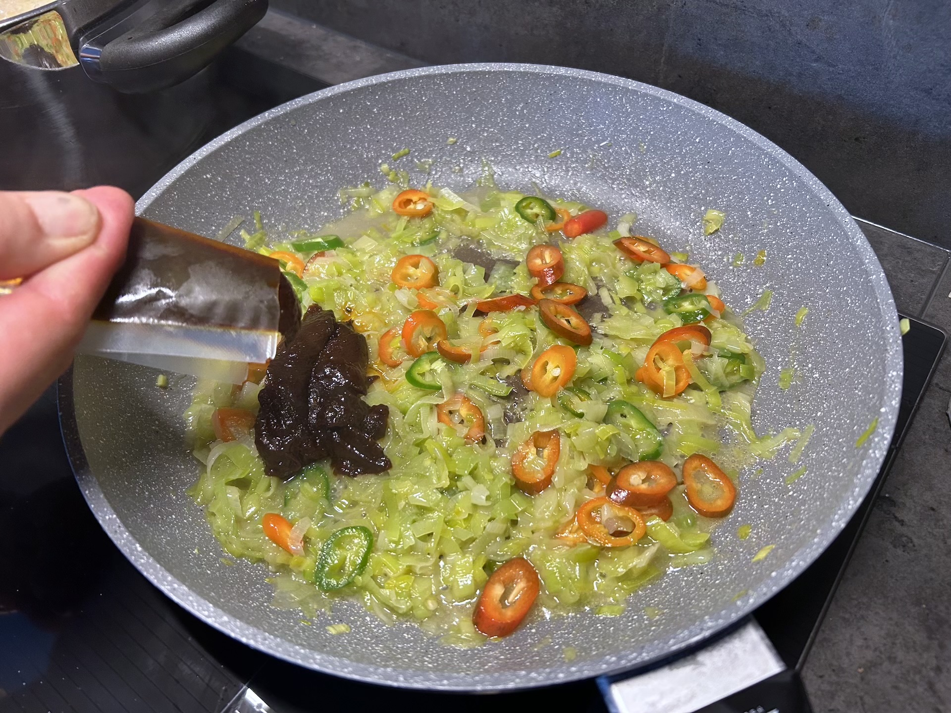 Gdy por jest miękki, dodaj na patelnię posiekane chilli oraz pastę Nasi Goreng i wymieszaj.