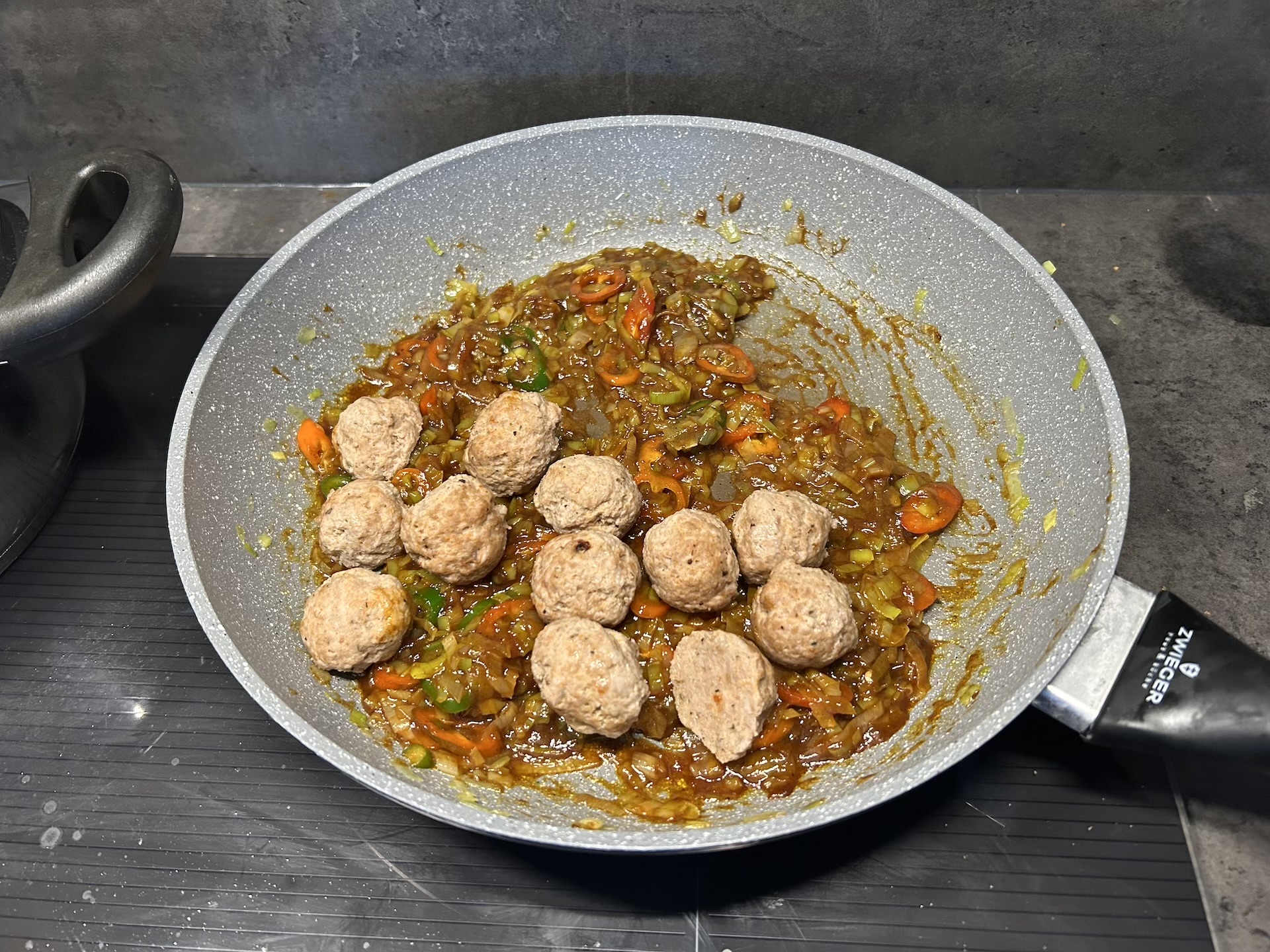 Włóż pulpety na patelnię z porem i sosem. Następnie delikatnie wymieszaj.