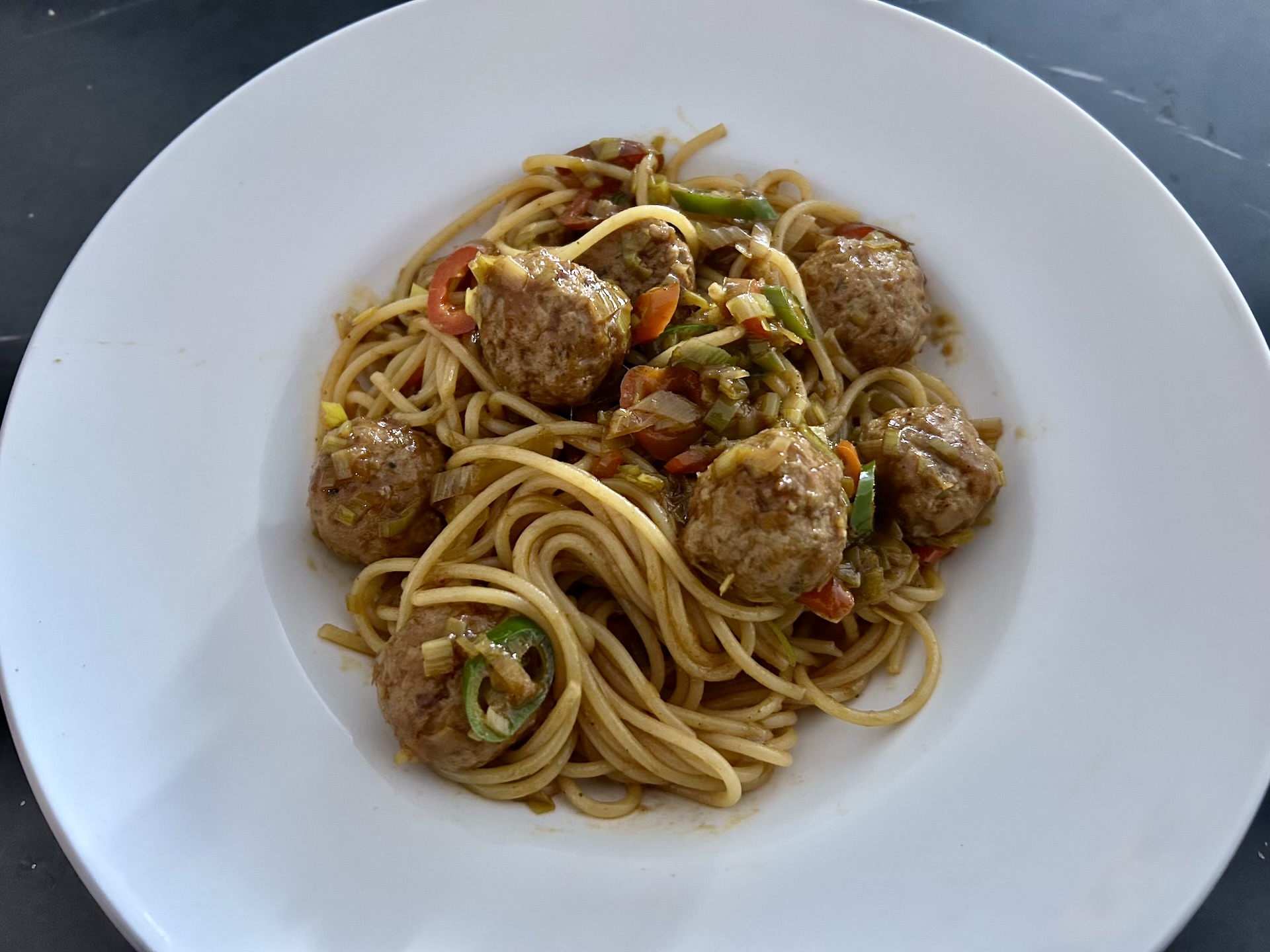 To propozycja stosunkowo łatwego i szybkiego obiadu z klopsikami doprawionymi orientalnymi przyprawami i sosem na bazie pasty Nasi Goreng.