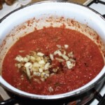 Duś na małym ogniu przez około 45 minut (aż sos dobrze odparuje). W razie potrzeby dolej odrobinę wody, by pomidory nie przywarły.