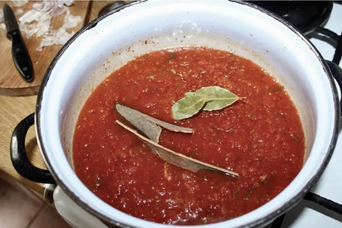 Pokrojone pomidory wrzuć do garnka. Dodaj sól, liście laurowe, laskę cynamonu, oregano i oliwę.