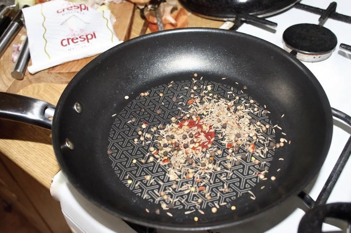Na suchej patelni upraż ziarna przypraw (kolendra, kmin, pieprz, chilli), a następnie zetrzyj je w moździerzu.