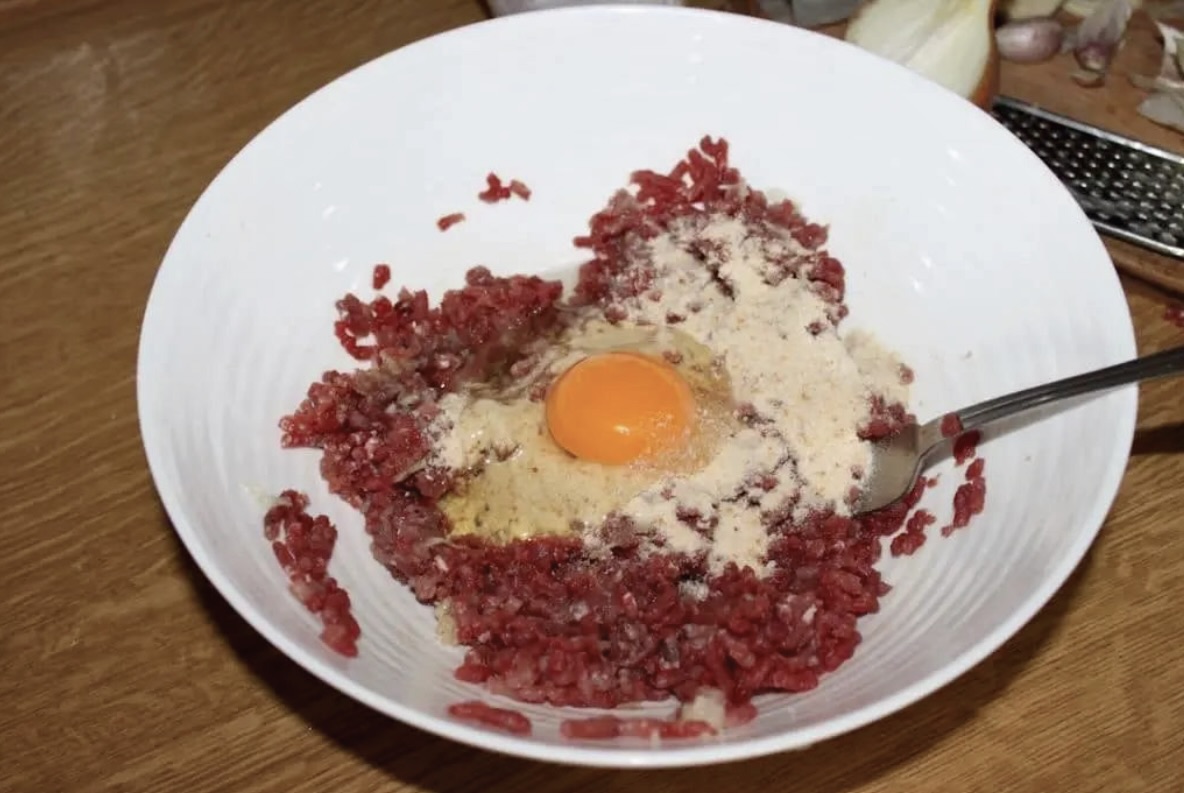Zmiel mięso, dodaj do niego starte 2 ząbki czosnku i jedną cebulę.