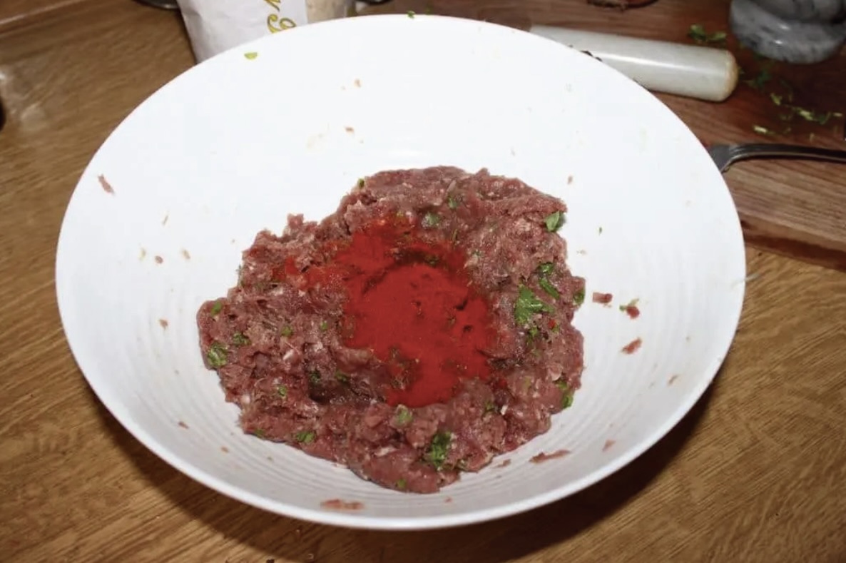 Dodaj jajko, bułkę tartą, przyprawy z moździerza, natkę pietruszki, słodką i wędzoną paprykę oraz sól i pieprz.