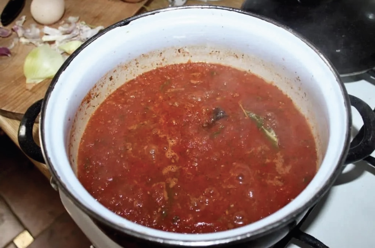 Duś na małym ogniu przez około 45 minut (aż sos dobrze odparuje). W razie potrzeby dolej odrobinę wody, by pomidory nie przywarły.