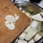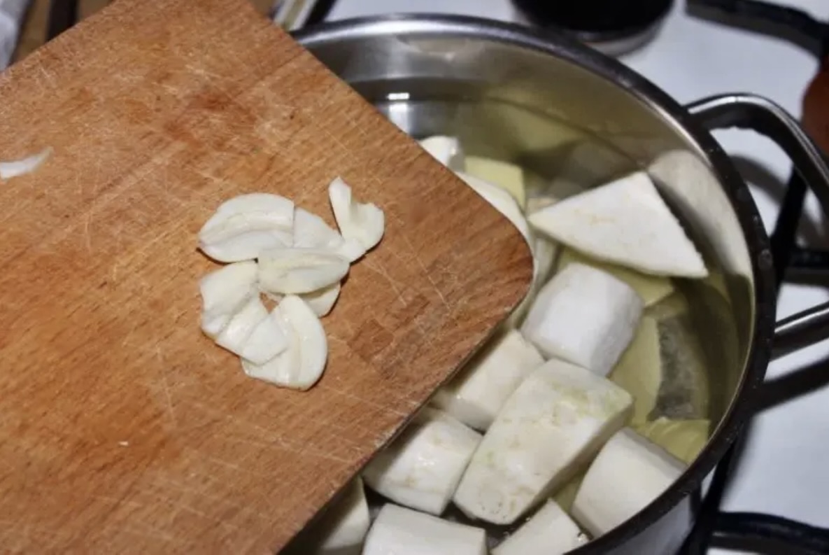 Czosnek obierz, grubo posiekaj i wrzuć do garnka z warzywami.