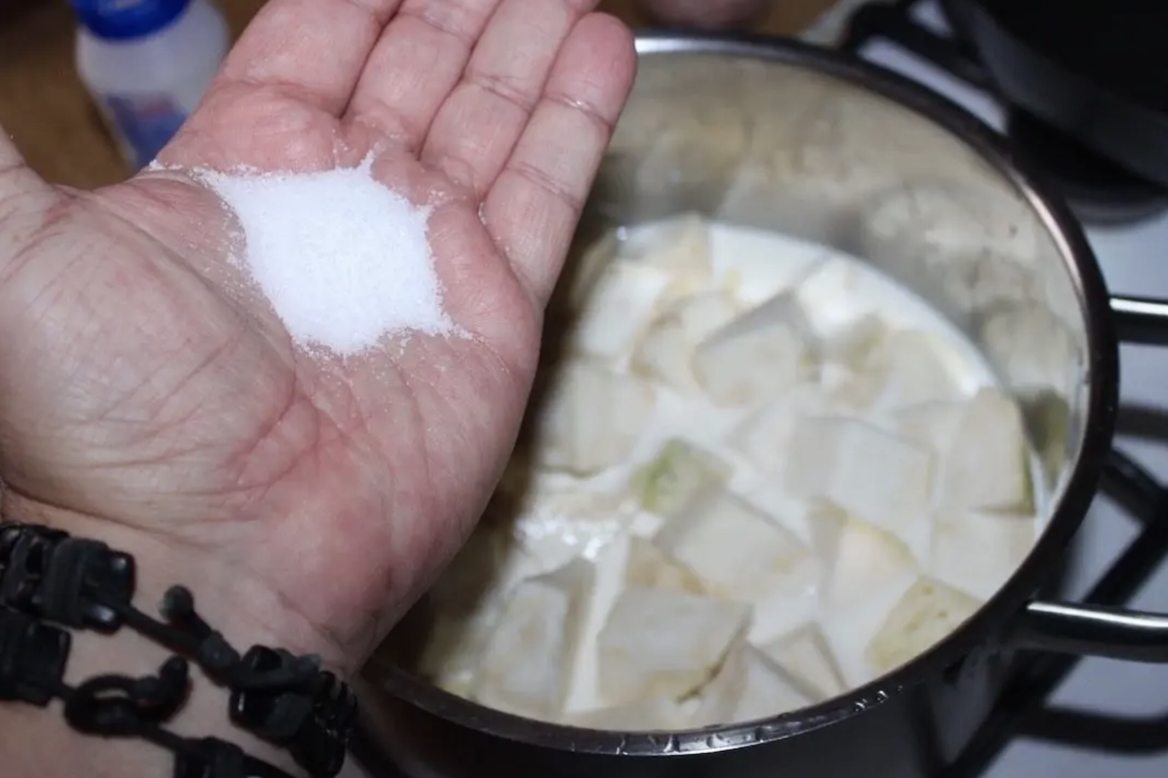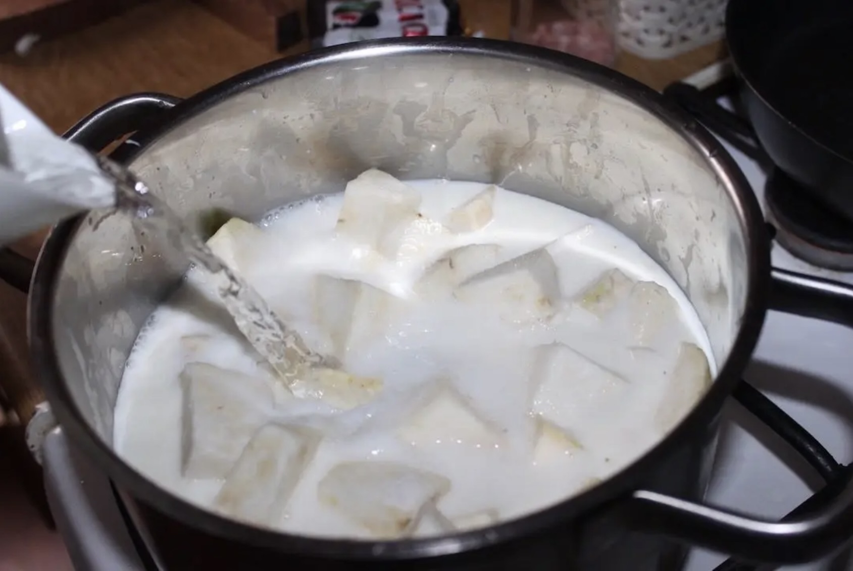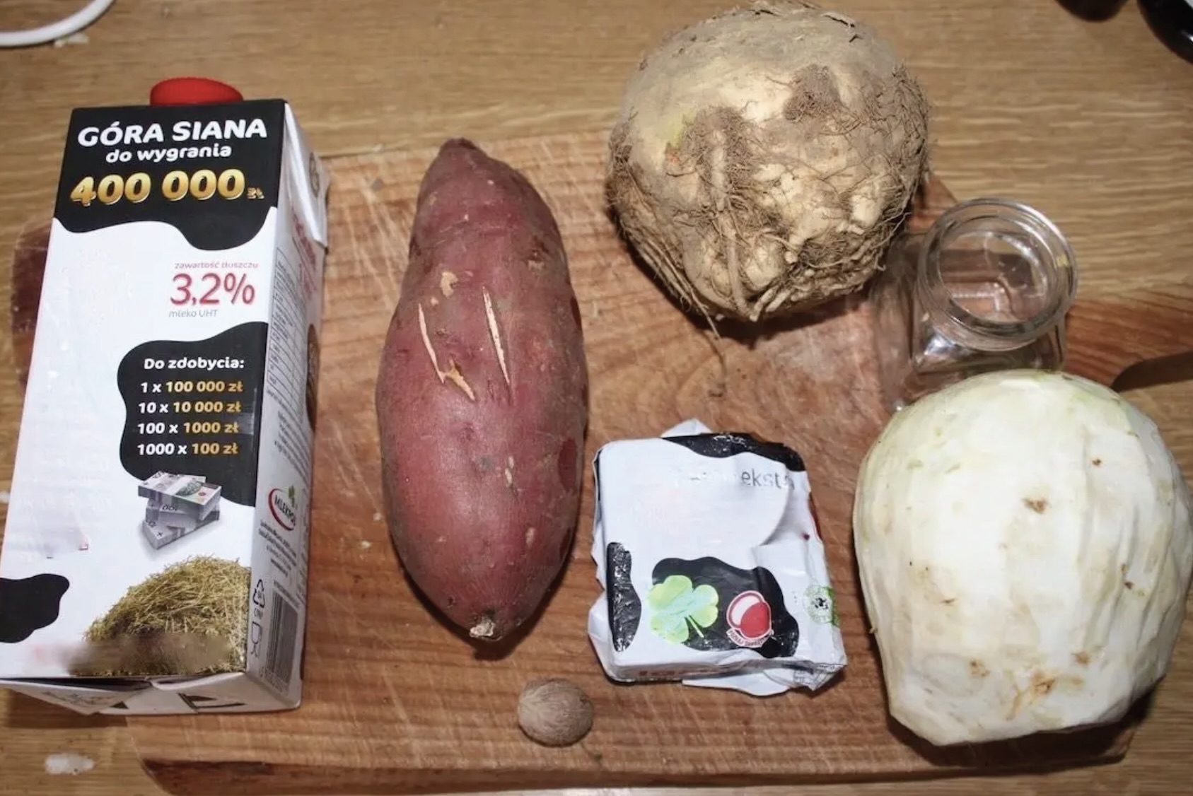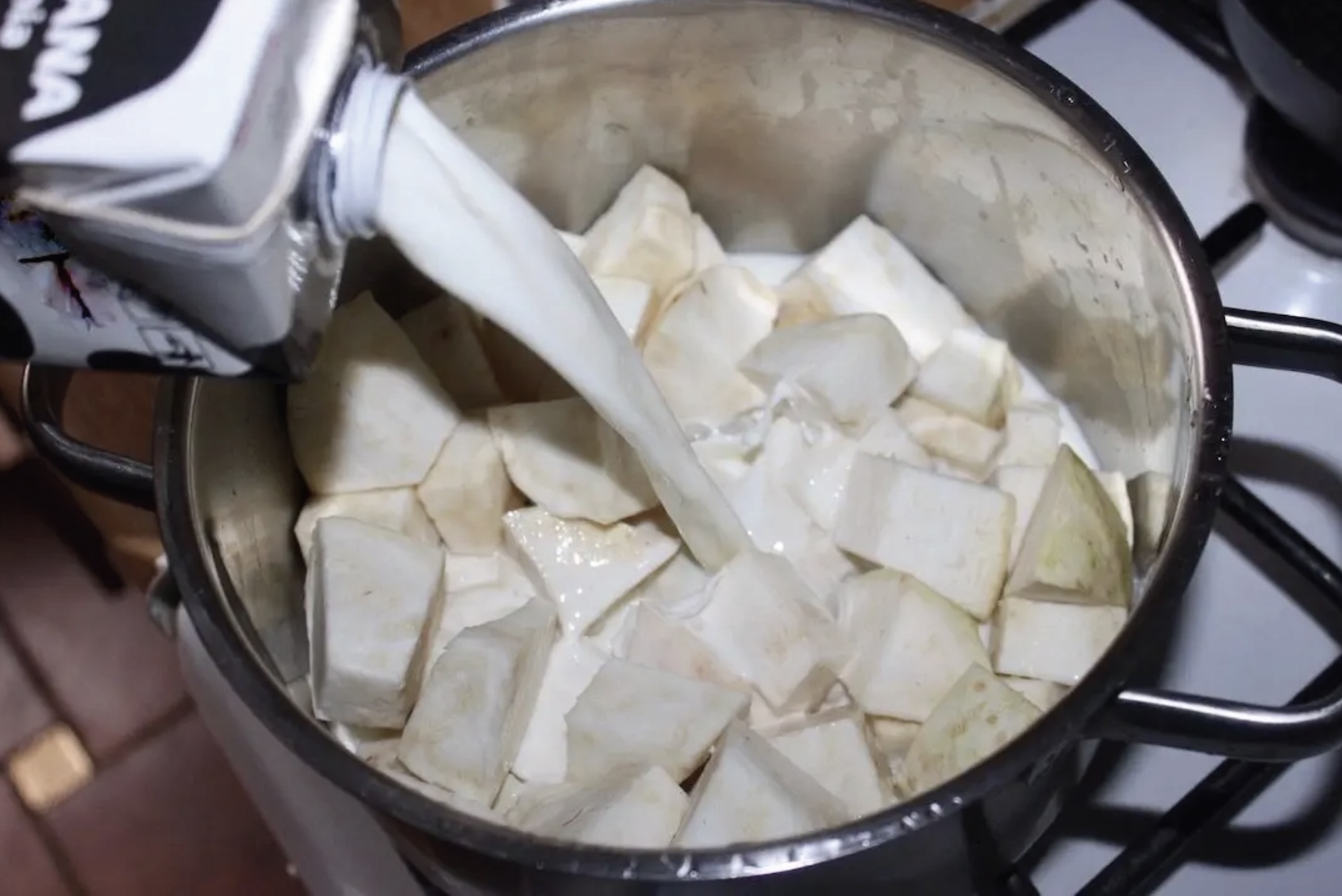 Przygotowanie selera: Obierz selera i pokrój w spore kawałki. Przełóż go do garnka, zalej mlekiem i dodaj sól do smaku. Wlej również szklankę zimnej wody (zapobiegnie to zrobieniu się kożucha i przypaleniu mleka). Doprowadź do wrzenia i gotuj na wolnym ogniu przez 5 minut. Uważaj, bo mleko może wykipieć!