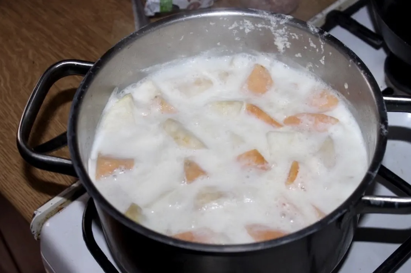 Dodanie batata: Podczas gotowania selera obierz i pokrój w spore kawałki batata. Wrzuć batata do garnka z gotującym się selerem i gotuj warzywa razem na wolnym ogniu jeszcze przez 10 minut, aż zmiękną.