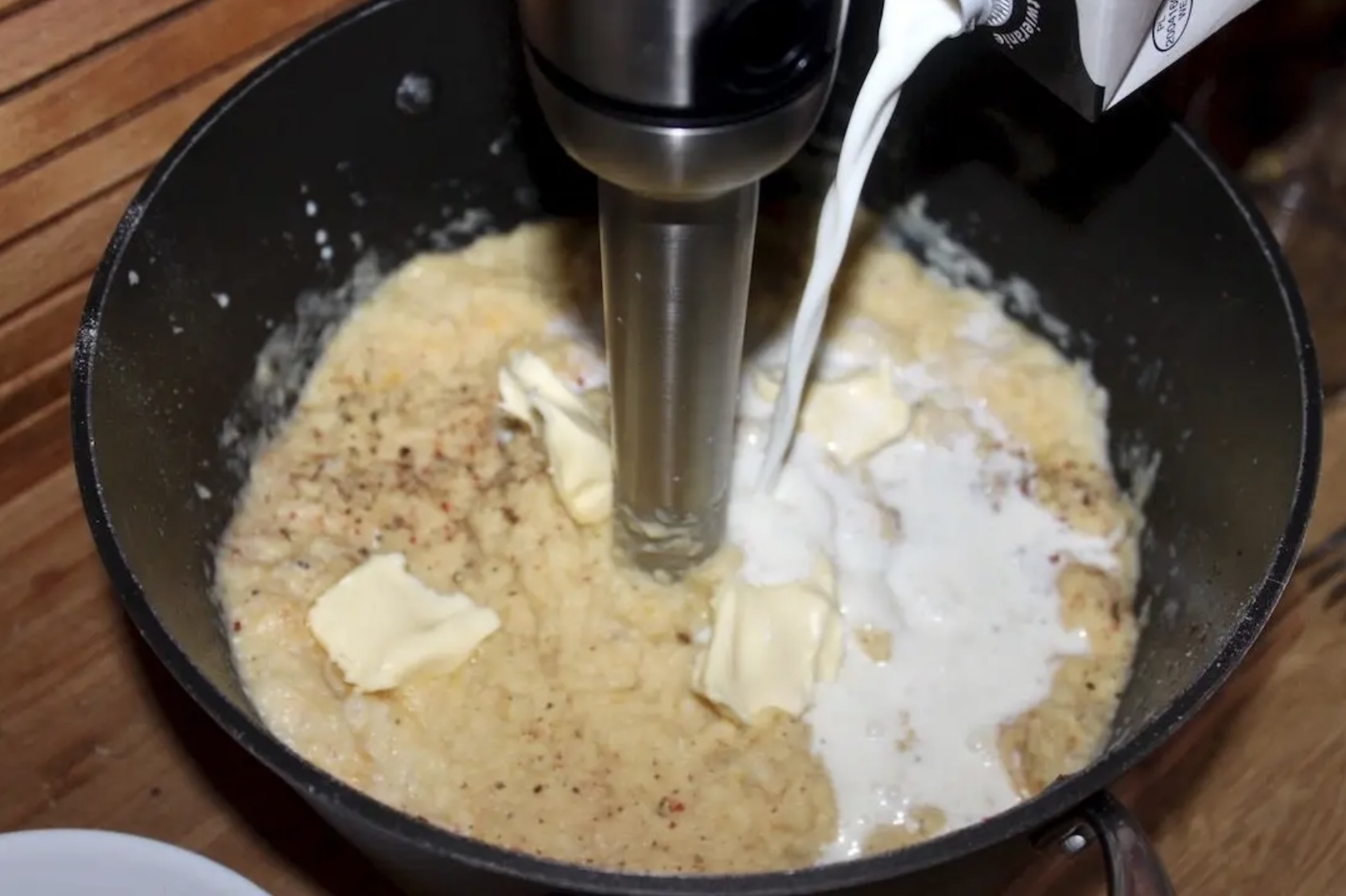 Miksowanie i doprawianie: Gdy warzywa są miękkie, odcedź je, zachowując szklankę płynu z gotowania. Do warzyw dodaj sól do smaku, świeżo zmielony pieprz i świeżo startą gałkę muszkatołową. Dodaj również dwie porządne łyżki masła i wlej pół szklanki mleka.