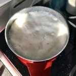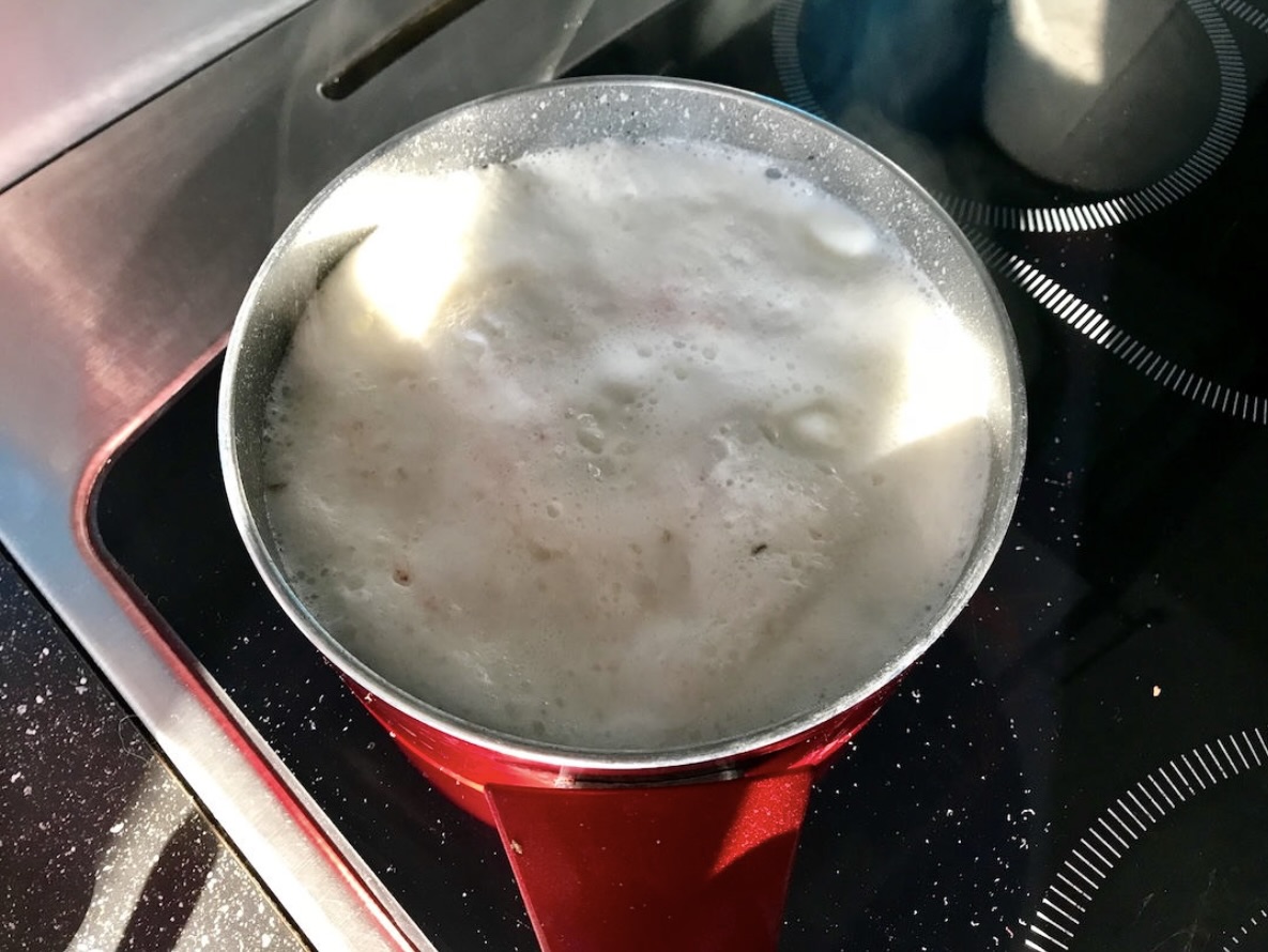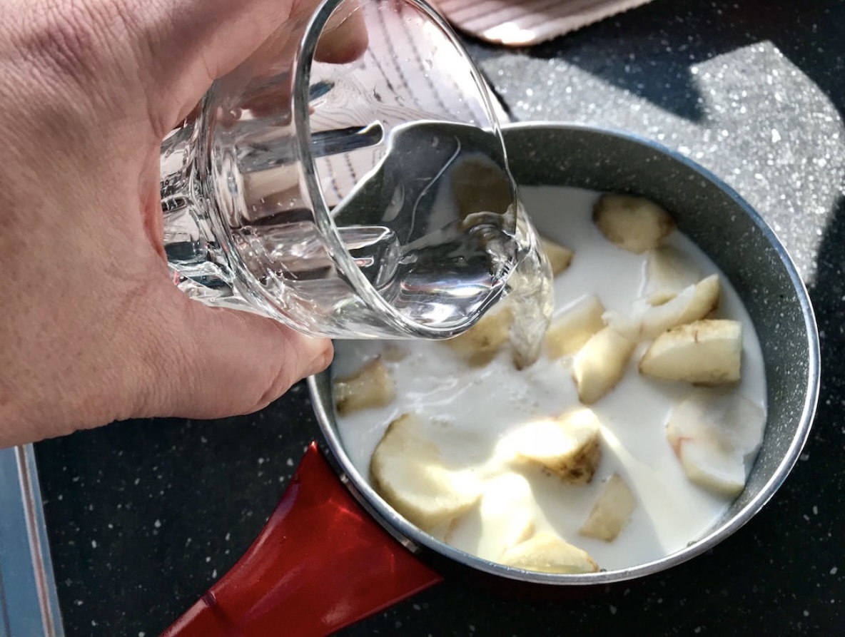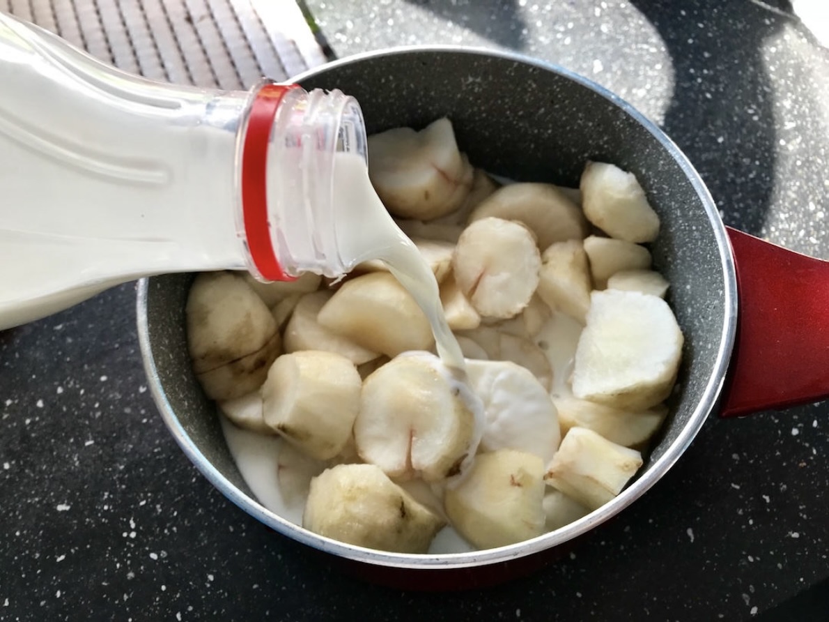 Gotowanie: Przełóż obrany topinambur do rondelka i zalej go mlekiem tak, aby był przykryty. Dodaj również szklankę zimnej wody – to zapobiegnie przypalaniu się mleka.