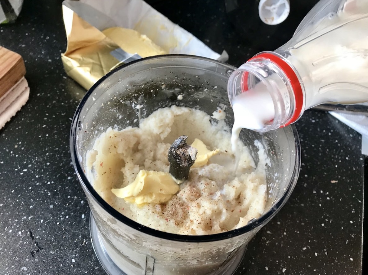 Miksuj: Odlej mleko, pozostawiając go nieco w garnku. Przełóż zawartość do miski malaksera (lub użyj blendera). Dodaj jedną porządną łyżkę masła, trochę soli, świeżo zmielony pieprz oraz zetrzyj dość sporo gałki muszkatołowej.