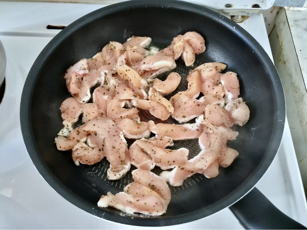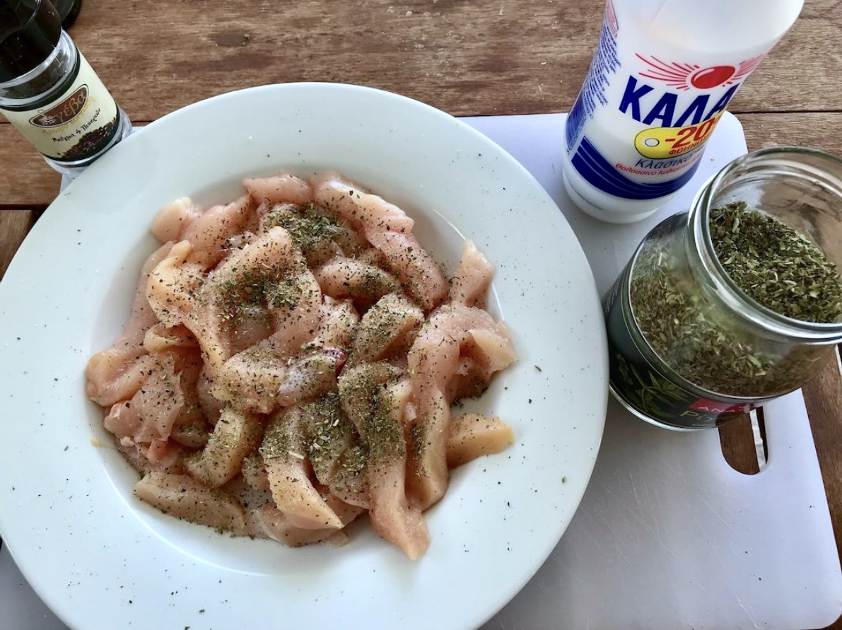 Przygotowanie kurczaka: Mięso umyj, osusz, a następnie usuń skórę. Pokrój w dość cienkie paski. Dopraw solą, świeżo zmielonym pieprzem i sporą ilością suszonego oregano. Wymieszaj, by przyprawy dokładnie pokryły kurczaka.