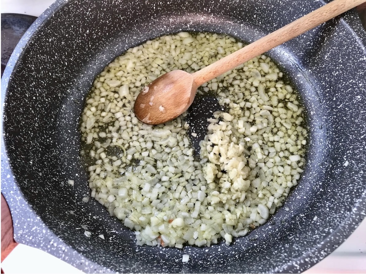 Smażenie warzyw i grzybów: Cebulę pokrój w kostkę, a czosnek drobno posiekaj. Na patelni rozgrzej oliwę, zeszklij cebulę, a po chwili dodaj czosnek (smaż niecałą minutę). Wrzuć pokrojone na mniejsze kawałki pieczarki, dopraw solą oraz pieprzem, a następnie smaż kilka minut, aż ładnie zbrązowieją.