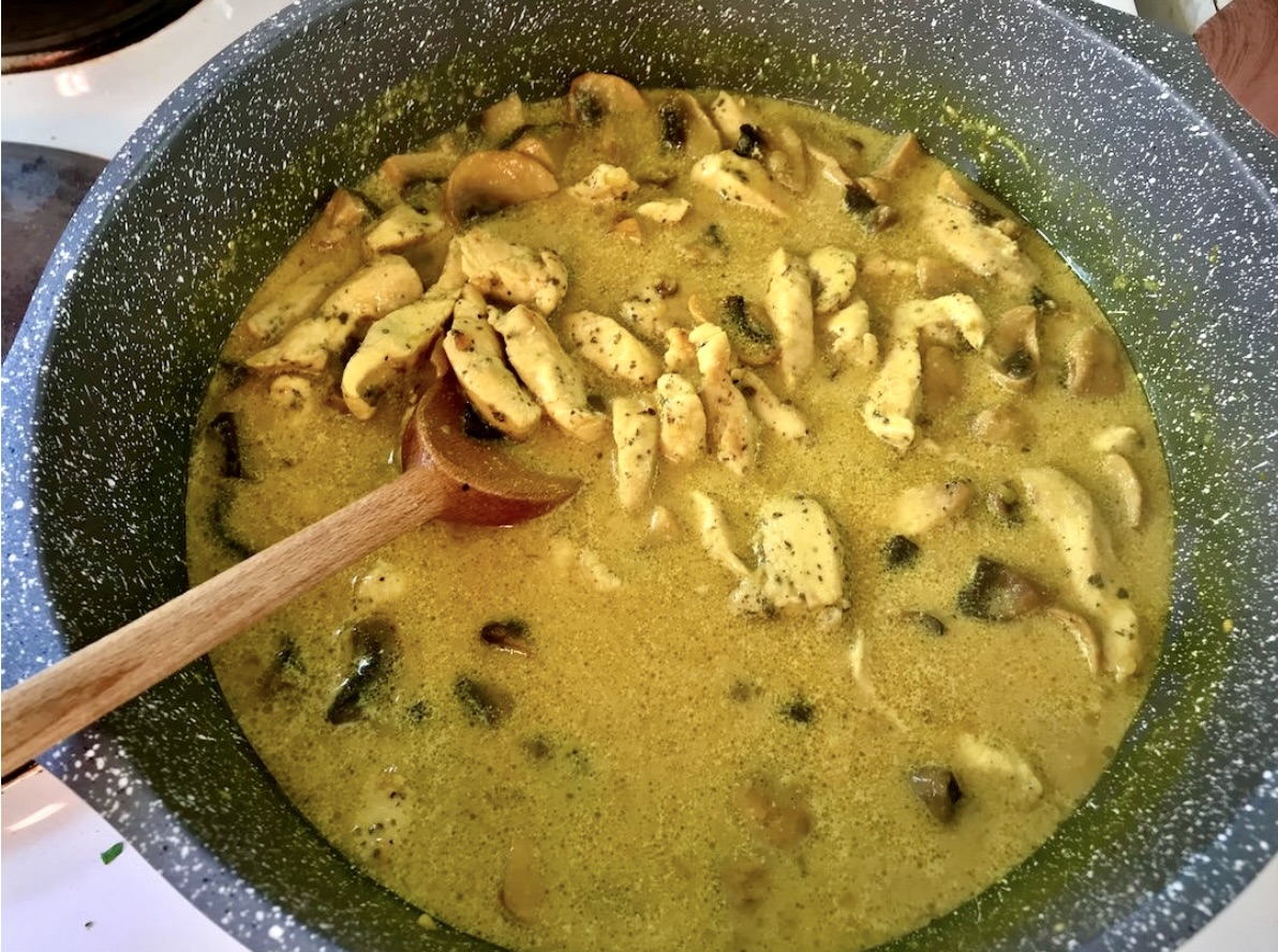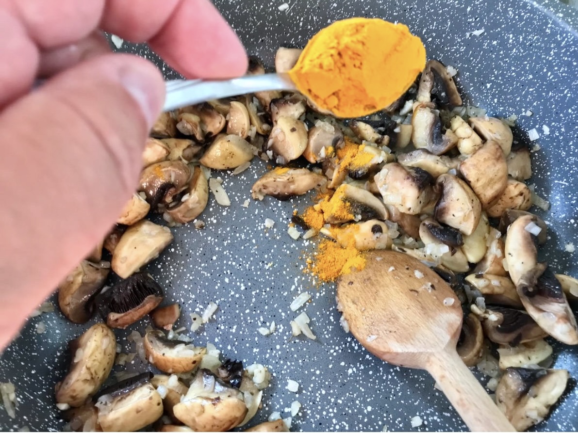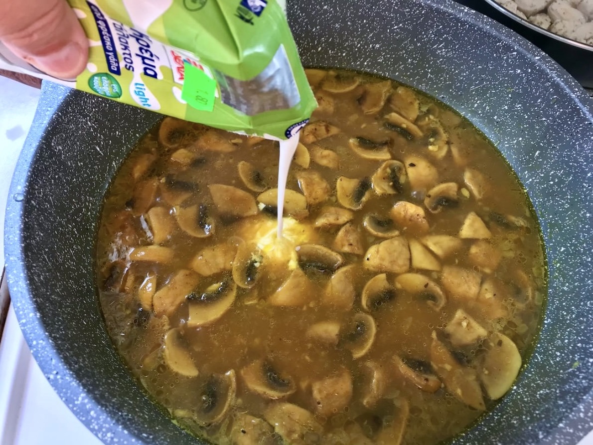 Duszenie sosu: Do pieczarek wsyp 2 łyżeczki kurkumy i oregano. Całość zalej gorącym bulionem. Przykryj patelnię i duś na małym ogniu przez około 20 minut. Po tym czasie wlej słodką śmietankę, a następnie gotuj dalej bez przykrycia, aby sos lekko odparował i się zredukował.