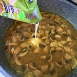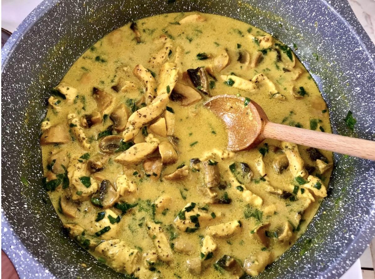 Łączenie składników: Przełóż podsmażone mięso do sosu z pieczarkami. Duś razem jeszcze kilka minut na średnim ogniu – kurczak dojdzie w środku, a sos stanie się idealnie gęsty.