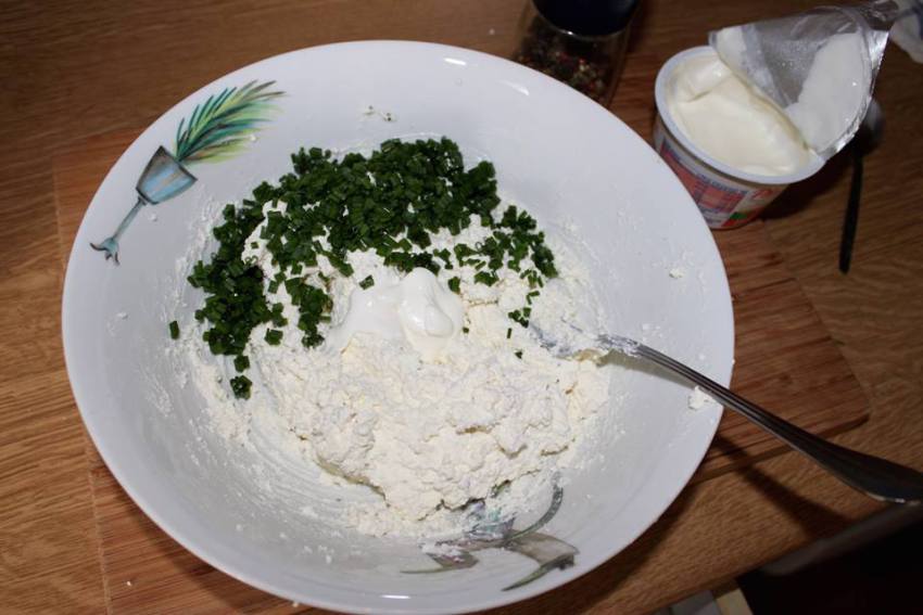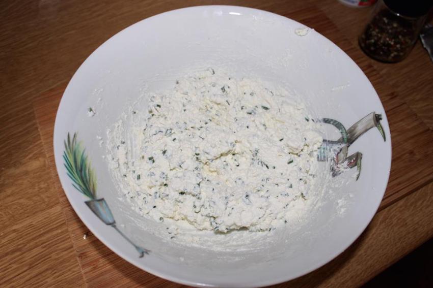 Wymieszanie: Wymieszaj wszystko dobrze, aż uzyskasz konsystencję pasty. Gzik nie powinien być zbyt suchy, więc w razie potrzeby dodaj więcej śmietany.
