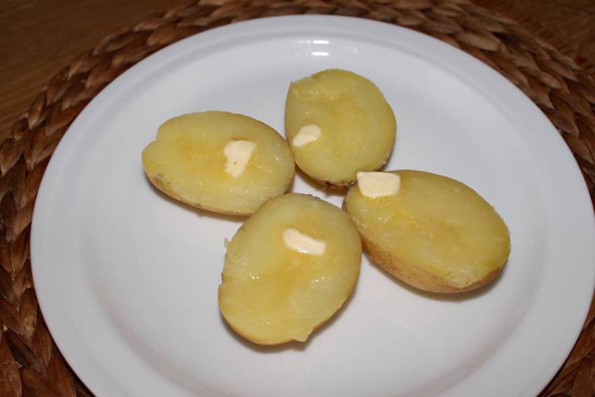 Masło: Na środek każdej połówki ziemniaka nałóż mały kawałek masła, aby wzbogacić smak (i poczekaj, aż się roztopi).