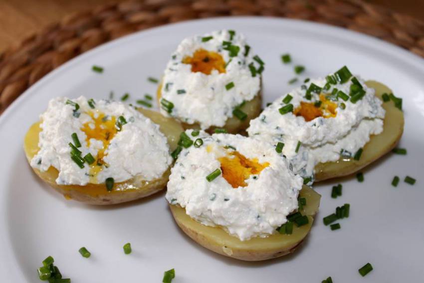Krojenie: Ugotowane ziemniaki odcedź i przekrój wzdłuż na połówki. Rozłóż je na talerzach.