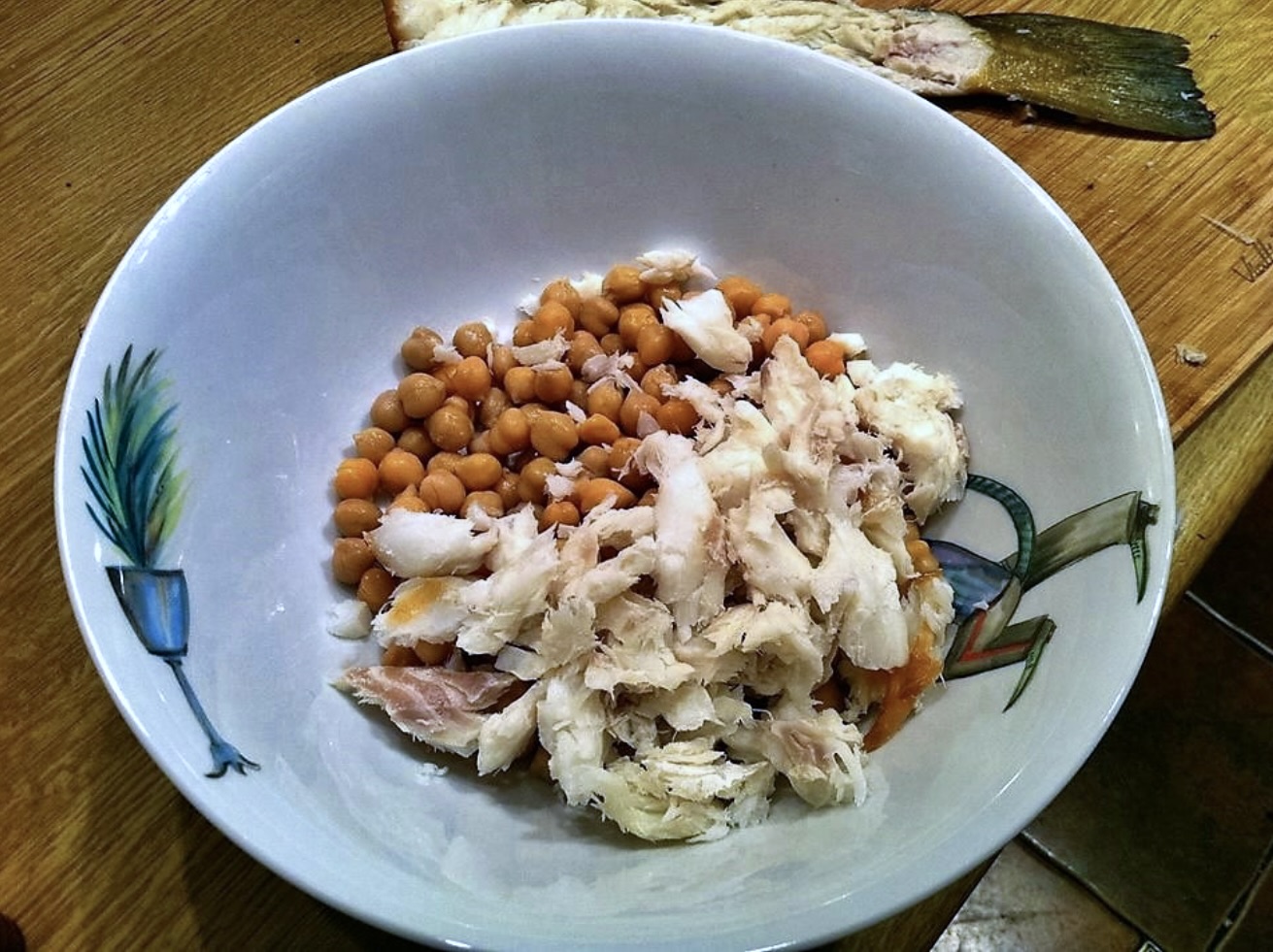 Połączenie składników: Oczyszczone mięso dorsza przełóż do miski. Dodaj do niego odcedzoną, przepłukaną i dobrze odsączoną ciecierzycę z puszki.