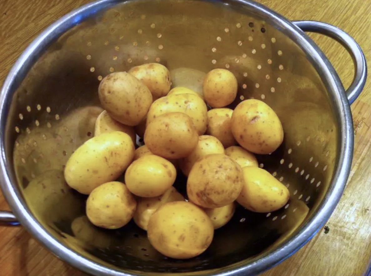 Ziemniaki: Ziemniaki dokładnie wyszoruj i ugotuj w mundurkach. Po ugotowaniu odcedź je i odstaw do przestygnięcia. Jeśli masz małe ziemniaki, przekrój je na pół; większe pokrój na mniejsze kawałki.