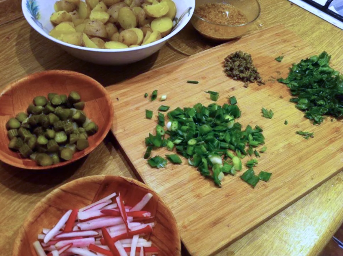 Łączenie składników: Wszystkie główne składniki (ziemniaki, rzodkiewki, ogórki, kapary) przełóż do dużej miski. Polej przygotowanym sosem, a następnie delikatnie wymieszaj (najlepiej dłońmi), aby sos dokładnie pokrył każdy kawałek.