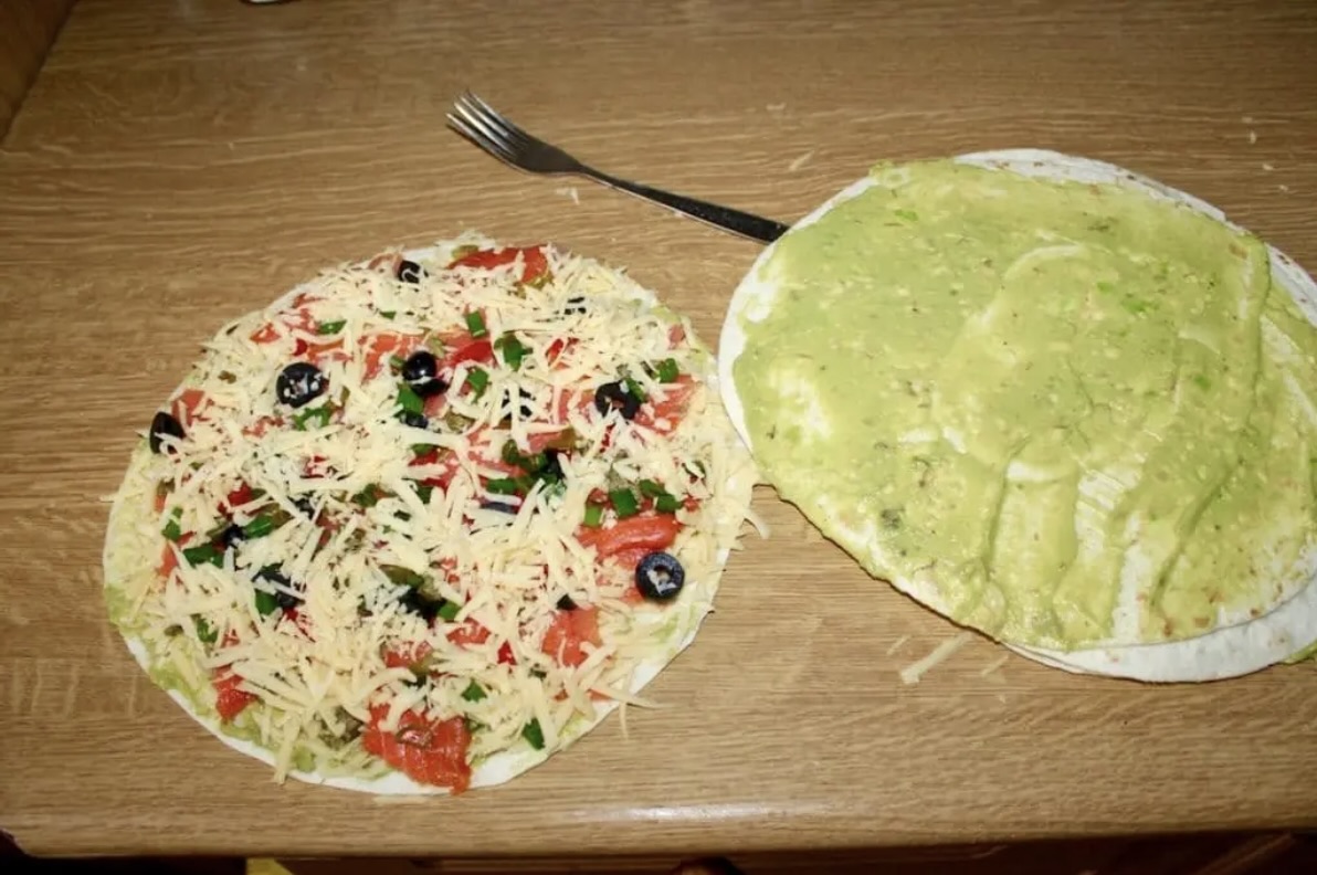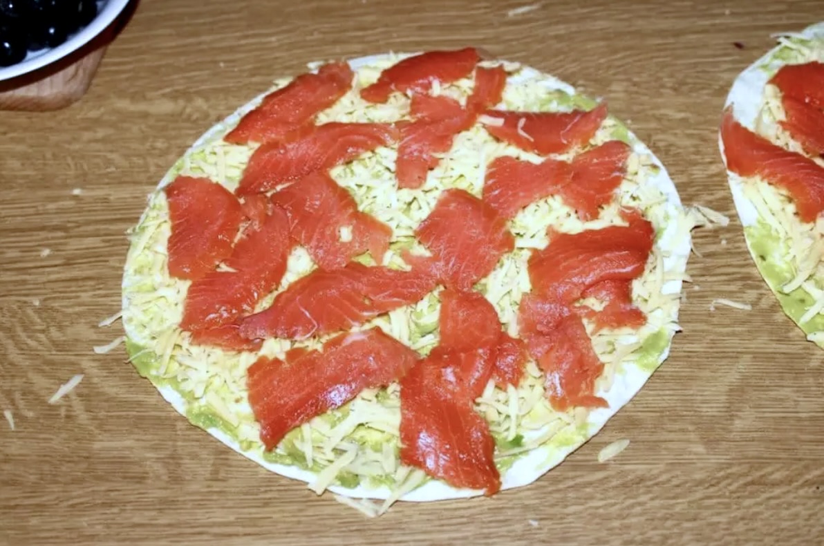 Na pierwszej tortilli rozsmaruj część pasty z awokado.