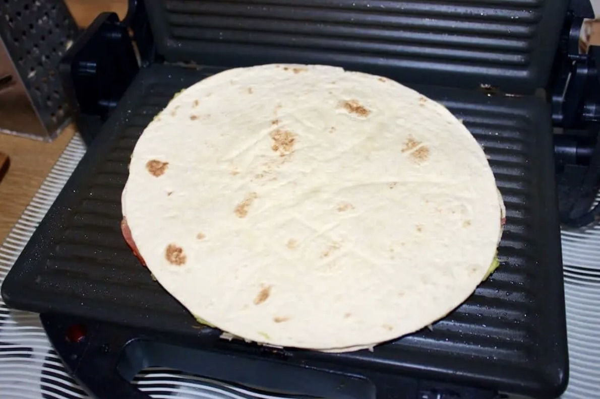 Smażenie: Połóż quesadillę na rozgrzanej patelni (grillowej lub zwykłej) i smaż na małym ogniu z obu stron, aż tortilla stanie się chrupka, a ser w środku całkowicie się rozpuści.
