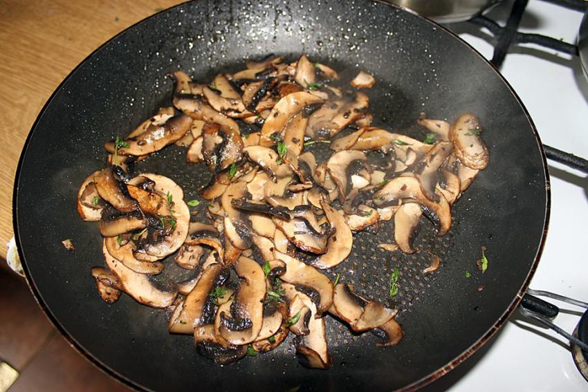 Pieczarki: Pieczarki oczyść (usuń nóżki), a następnie pokrój w cienkie plasterki. Usmaż je na oliwie z dodatkiem masła, doprawiając solą, pieprzem i listkami świeżego tymianku.