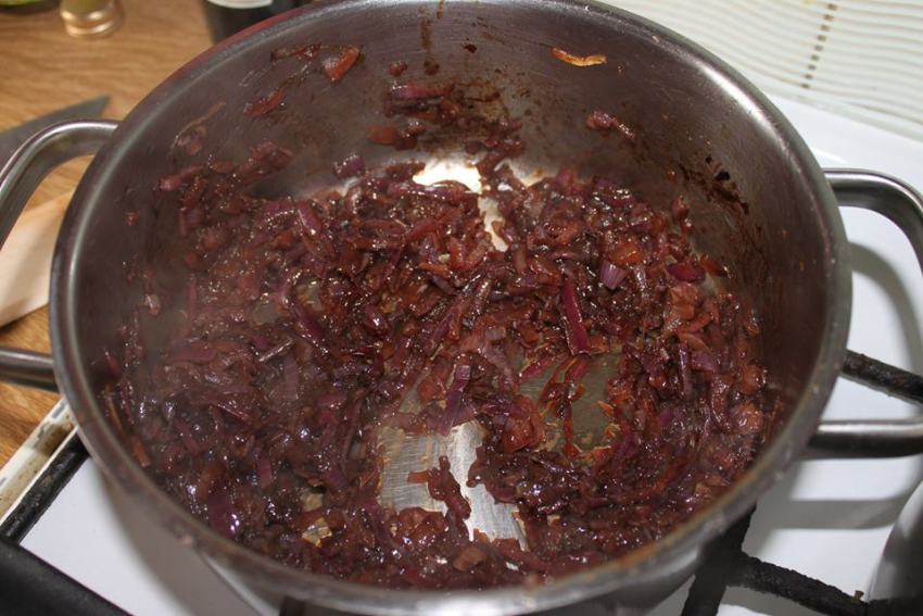 Karmelizowana cebula: Cebulę pokrój w piórka. Podgrzej oliwę w garnku i smaż cebulę na małym ogniu przez około 10 minut, aż zmięknie. Następnie dopraw solą, dodaj 1 łyżkę octu balsamicznego oraz 1 łyżkę kremu balsamicznego. Cebula powinna być słodko-kwaśna i ciemna.