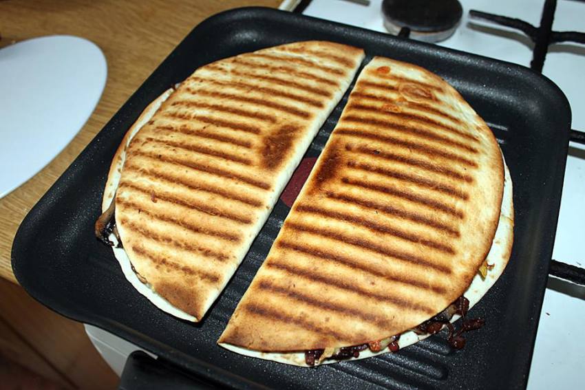 Smażenie: Podgrzewaj złożoną quesadillę na suchej patelni na średnim ogniu. Dociskaj ją co jakiś czas, aż ser w środku się rozpuści, a tortilla stanie się chrupiąca z obu stron.