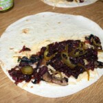 Na połowie tortilli ułóż: ser, pieczarki, karmelizowaną cebulę, kilka plasterków ostrej papryczki i ponownie odrobinę sera.
